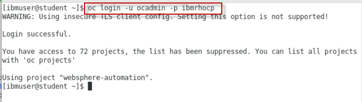 oc login -u ocadmin -p ibmrhocpto log in to Red Hat OpenShift.Use the following credentials to log in: