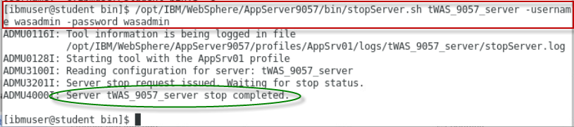 /opt/IBM/WebSphere/AppServer9057/bin/stopServer.sh tWAS_9057_server -username wasadmin -password wasadminCongratulations! You have completed the WebSphere Automation Memory Leak Detection lab.