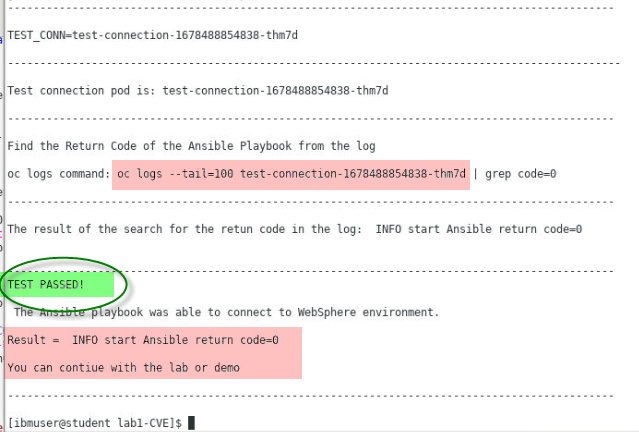 When the script completes, verify that the test-connection Ansible playbook ran successfully, as illustrated in the console output.