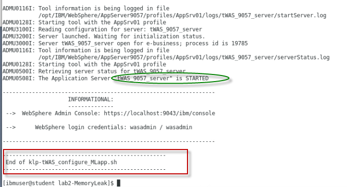 [ibmuser@student ~]$ /home/ibmuser/WAS-Automation-LabFiles/techxchange/lab2-MemoryLeak/klp-curl_MLApp_add_was.sh
