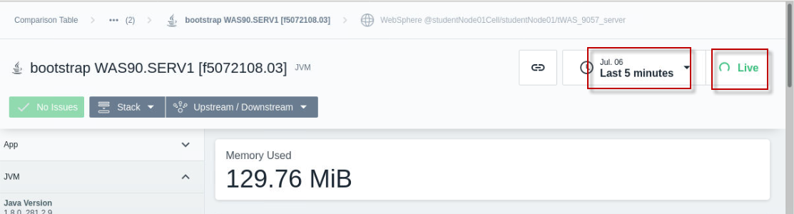 In this lab, you can also monitor the WebSphere application server memory change in Instana.