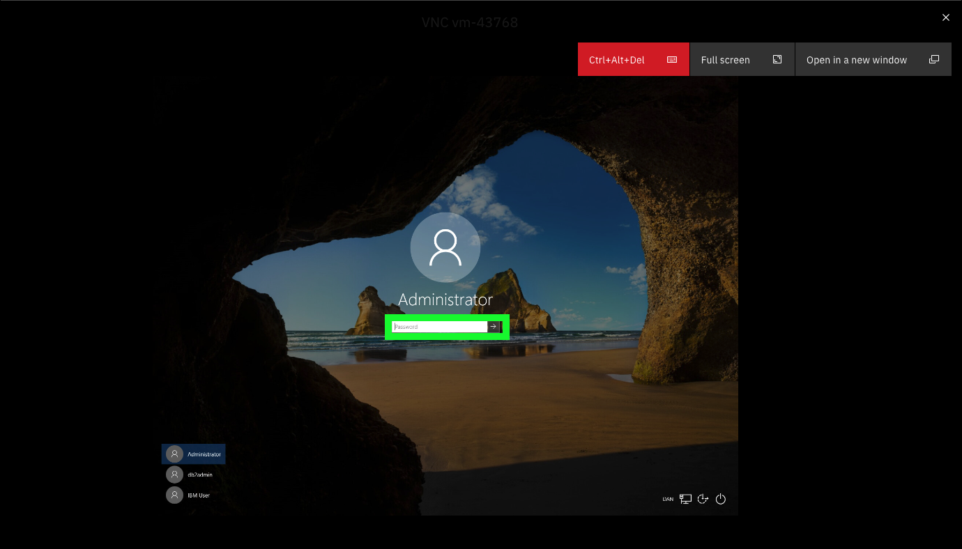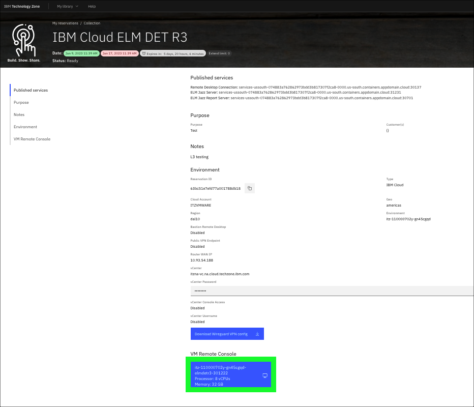 - Using the ITZ reservation details page under My Reservations on ITZ, click the VM Remote Console button at the bottom of the IBM Cloud ELM DET R3 details page.