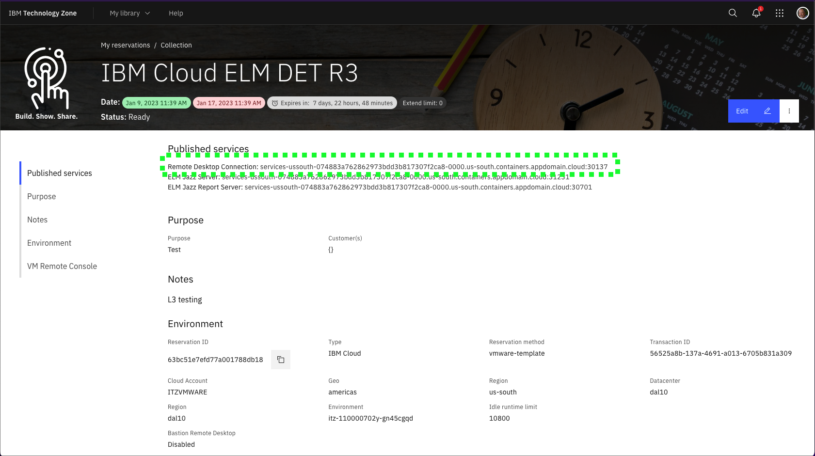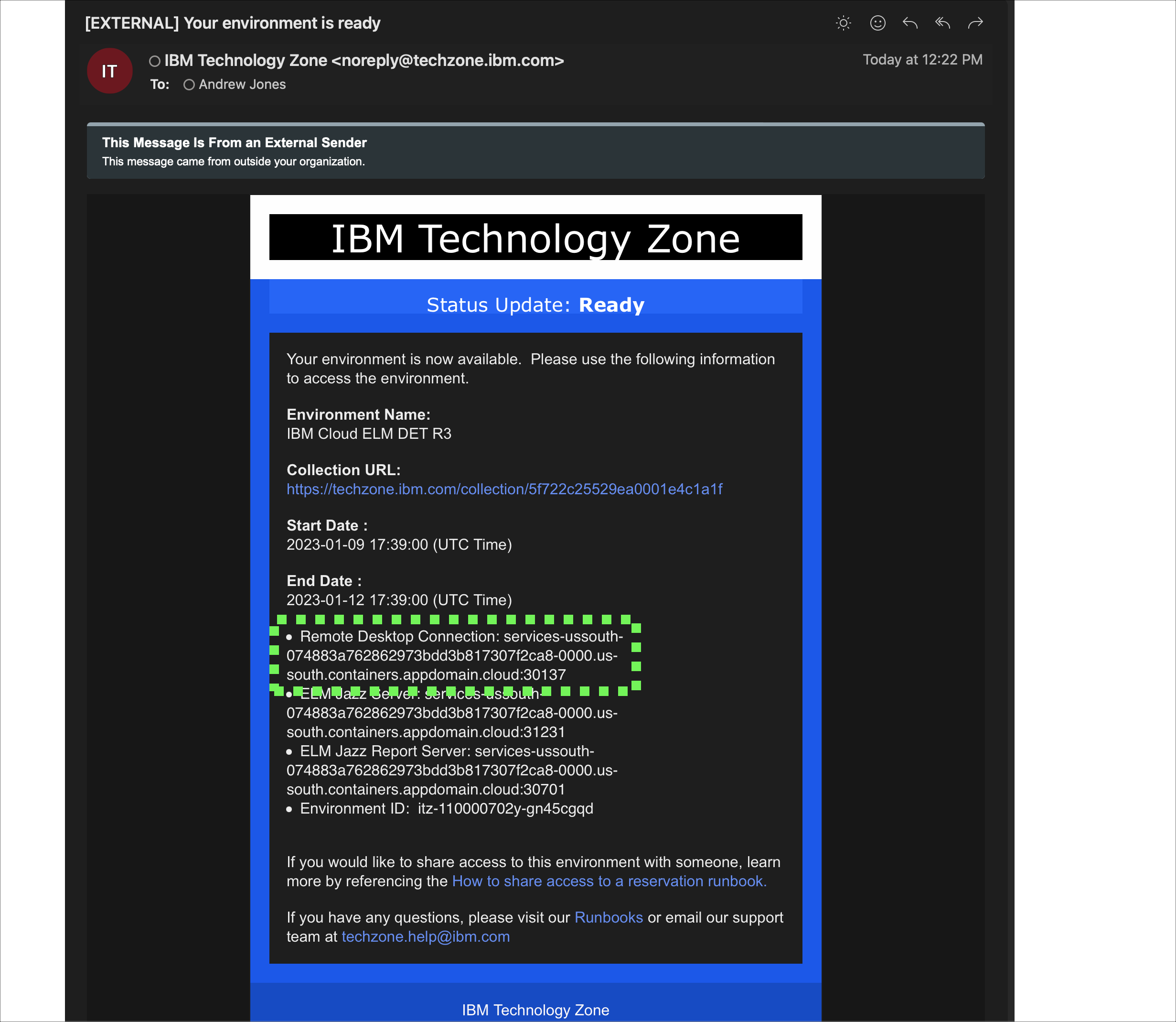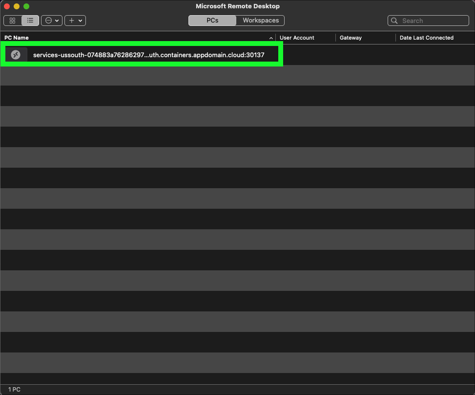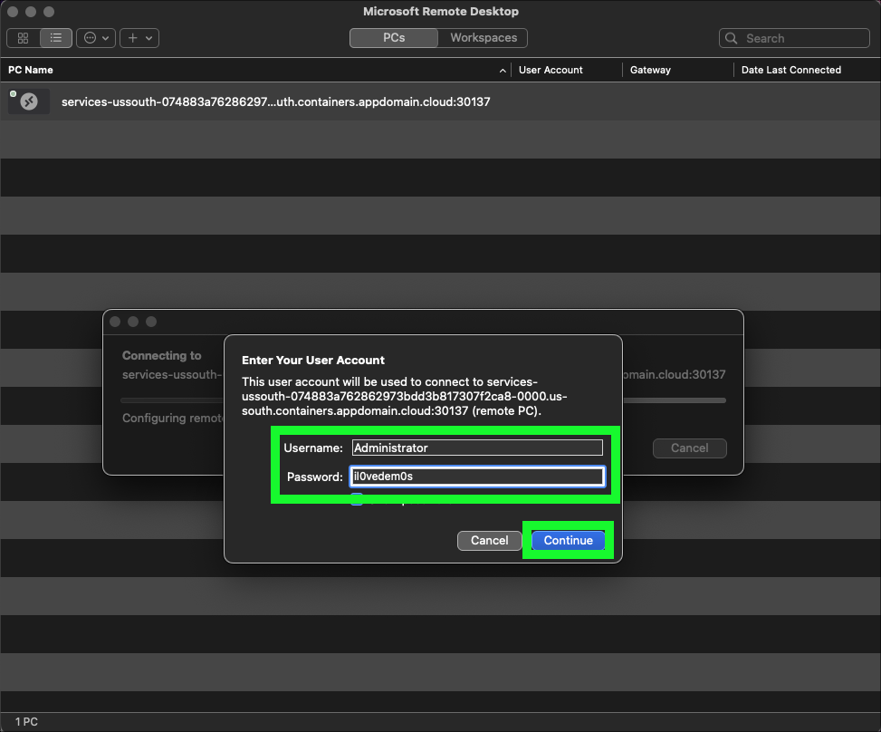 - Using either the IBM Technology Zone (ITZ) email with the subject Your environment is ready or the ITZ reservation details page, find and copy the Remote Desktop Connection field which will be in the format host:port.