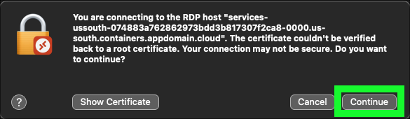 Click Continue if prompted about a certificate that could not be verified.