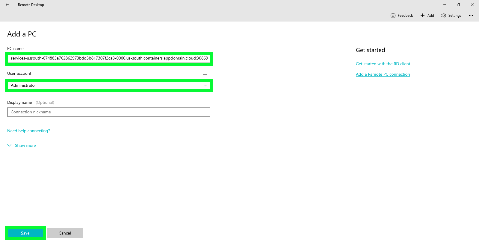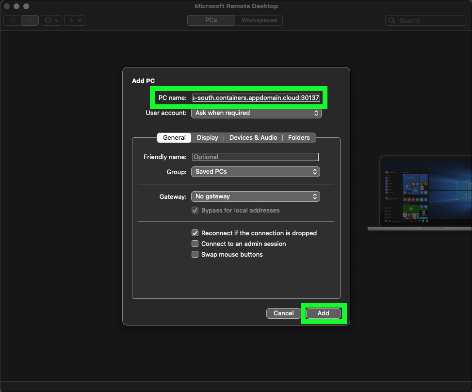 - Paste the host:port information from step 1 into the PC name: field.