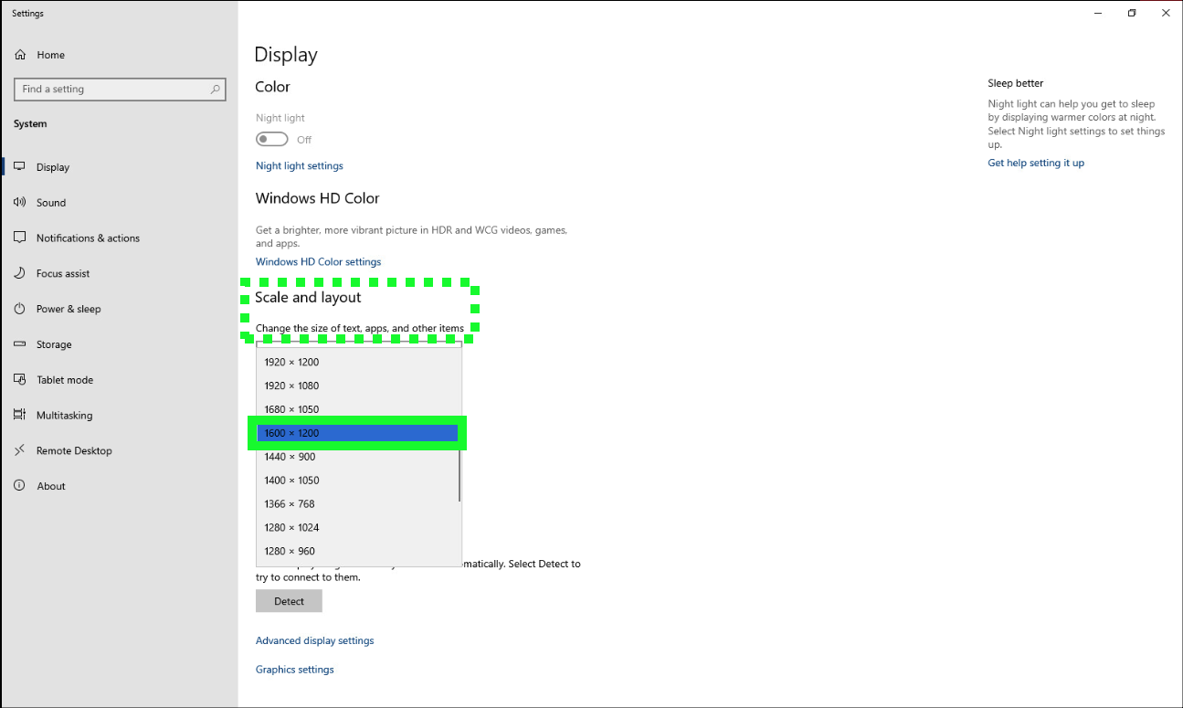 - On the Display settings page specify a resolution that looks best.