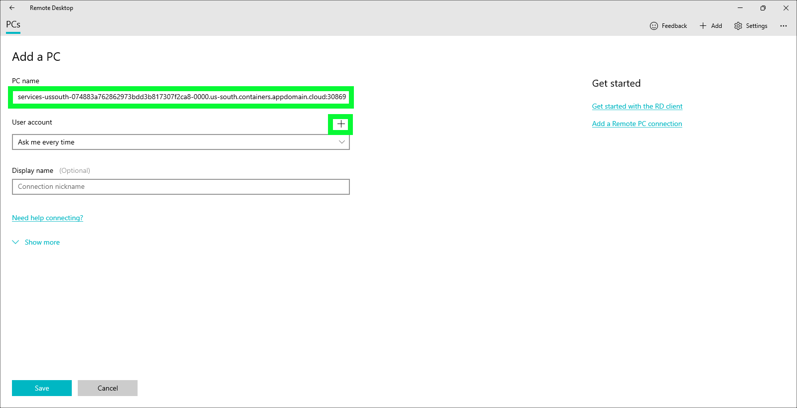 - Paste the host:port information from step 1 into the PC name: field and then press the + icon above the User account field.