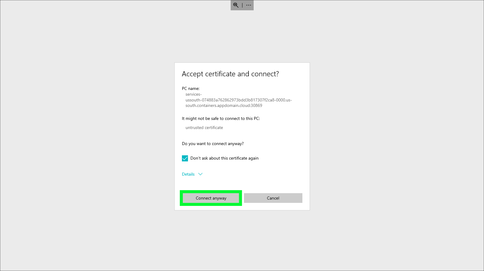Check the Don't ask about this certificate again checkbox and then click Connect anyway on the Accept certificate and connect dialog.
