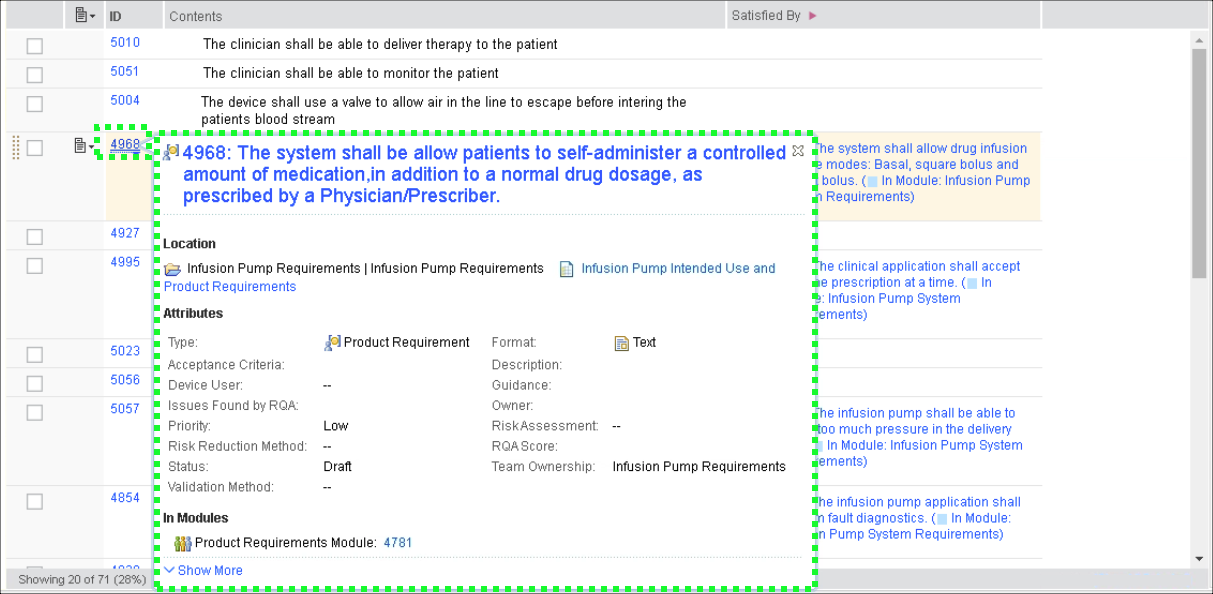 Notice the additional details about the requirement that are visible by simply hovering over the item in the table.