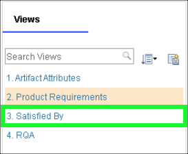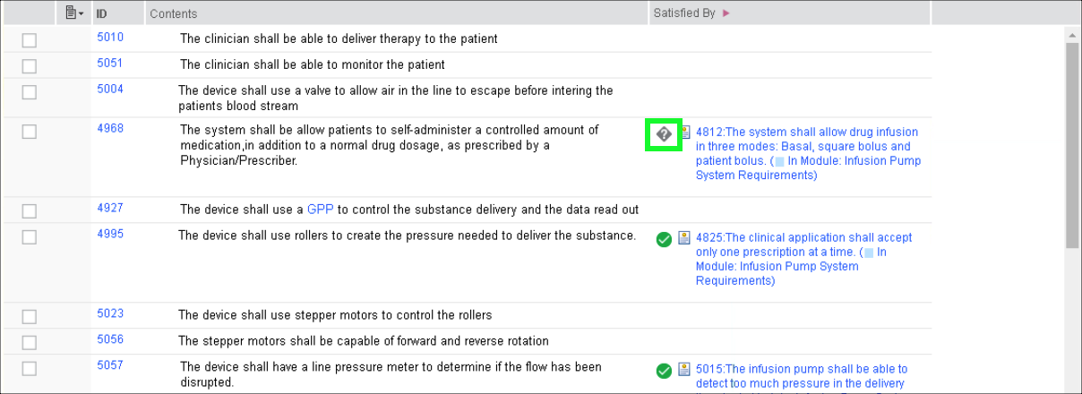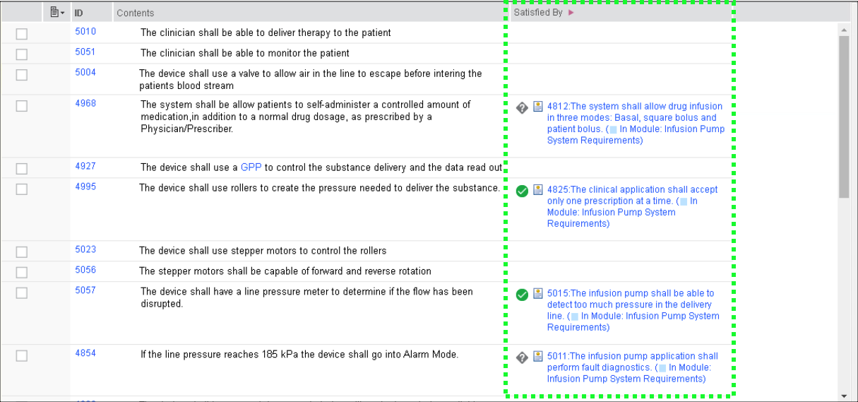 Here, traceability is seen in the Satisfied By column. Rows with data in the Satisfied By column provide links to the downstream system requirements that satisfy these higher-level requirements. Notice that several rows have no information in the Satisfied By column. These empty fields illustrate gaps in the requirements providing a gap analysis traceability view.