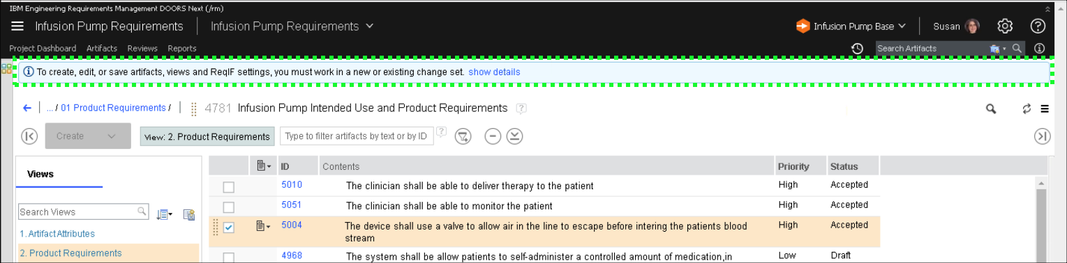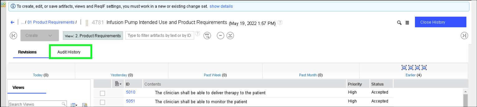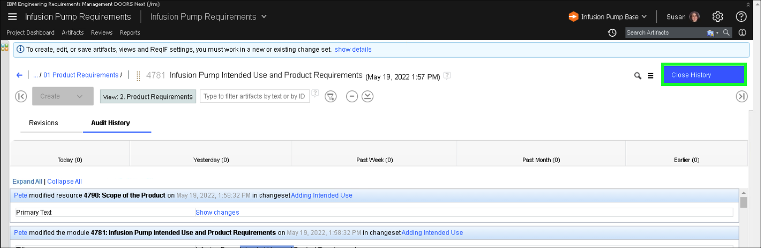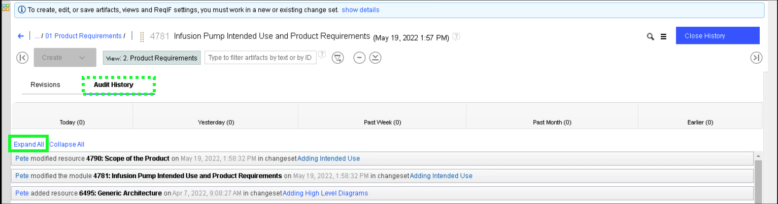 The message informs users that the module is under change management. Later in the demonstration script, a new change set will be created. For now, learn about the audit and traceability capabilities of ELM.