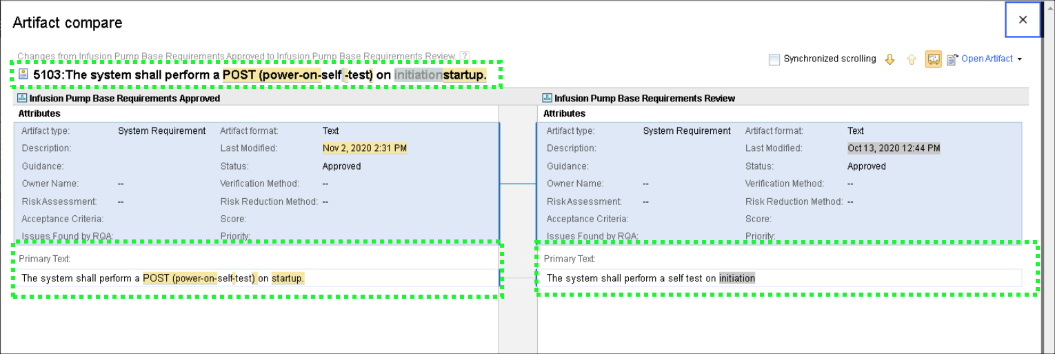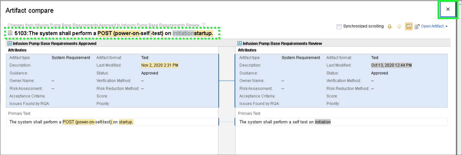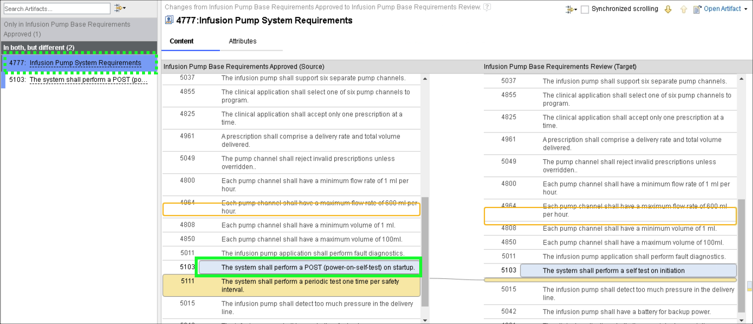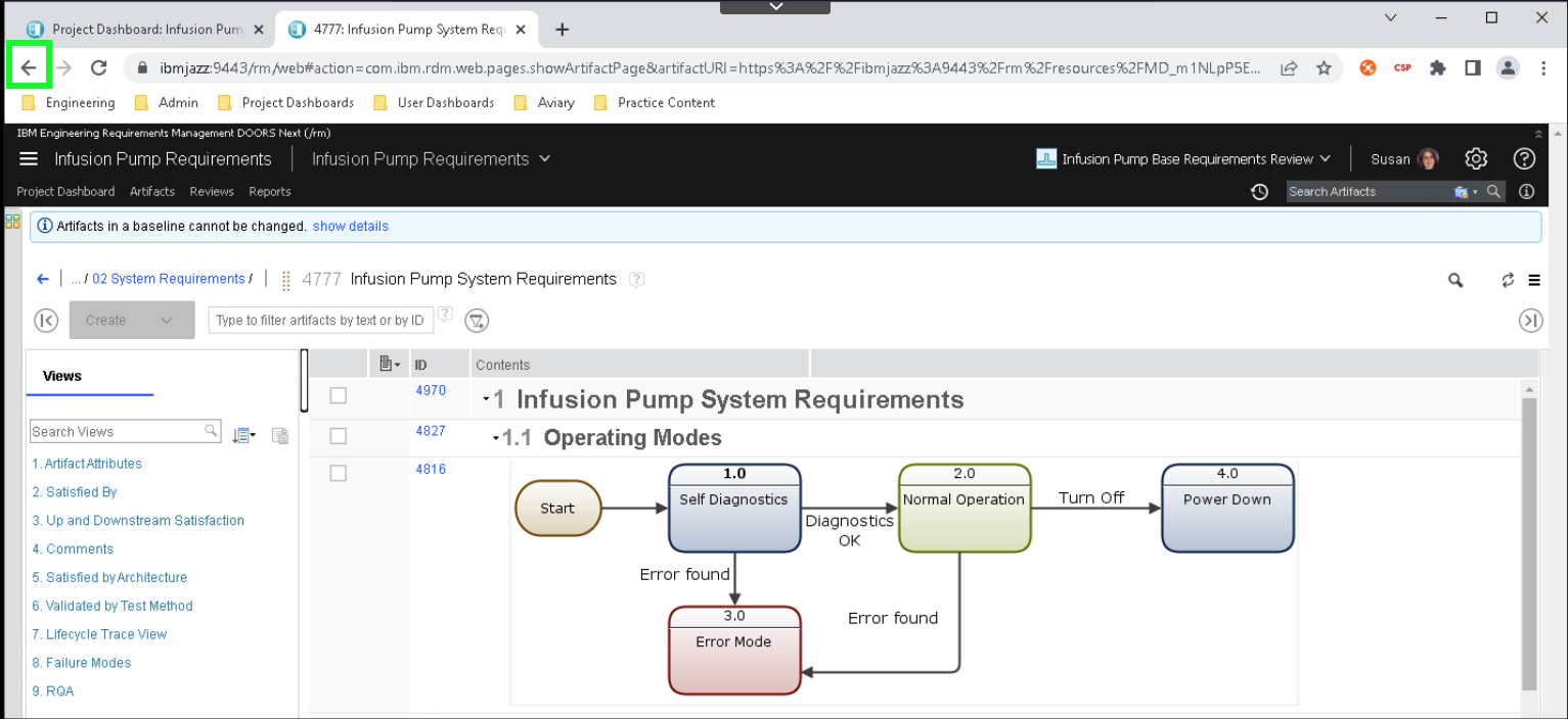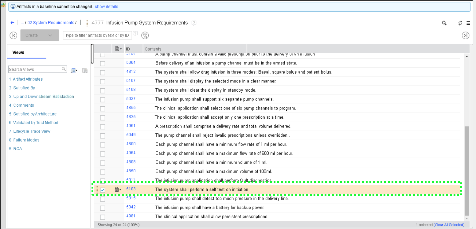 - Notice the link returns to the Requirements Review Baseline with 5103: The system shall perform a self test on initiation selected.