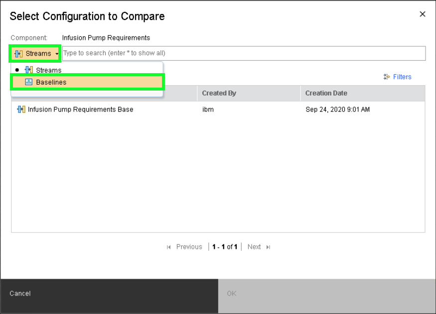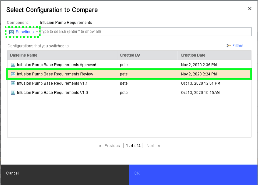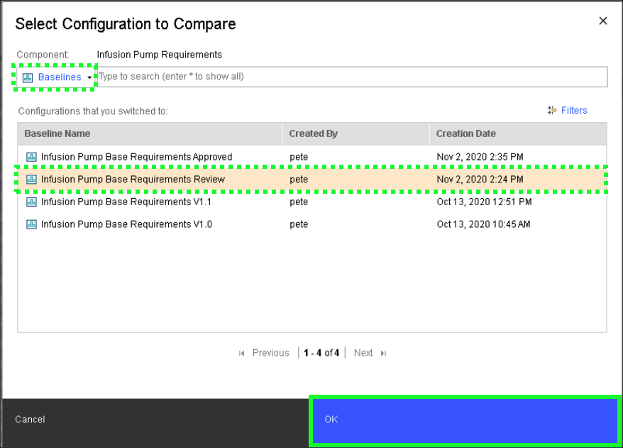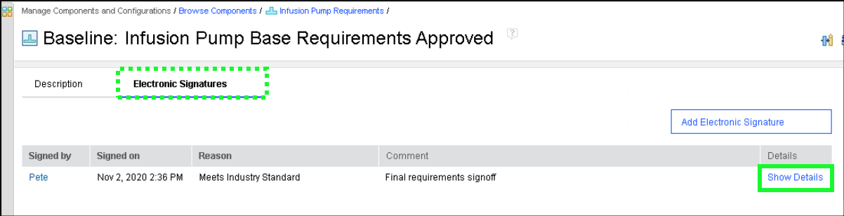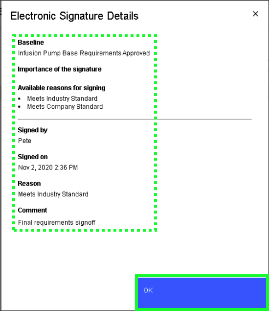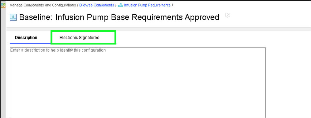 The platform can be configured such that changes cannot be delivered unless those changes are linked to a work item with the appropriate approvals. In this project, after the review cycle was completed and approved, a new baseline was taken and signed with an electronic signature as shown in the next steps.