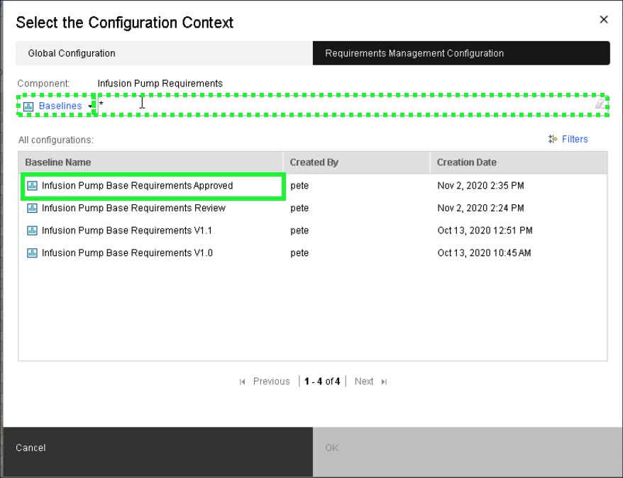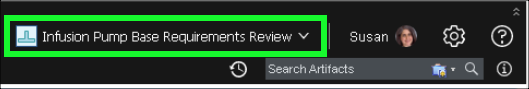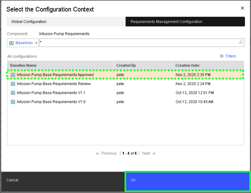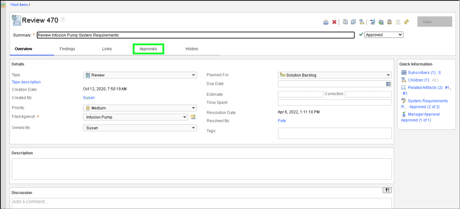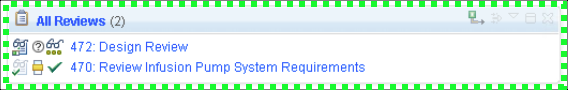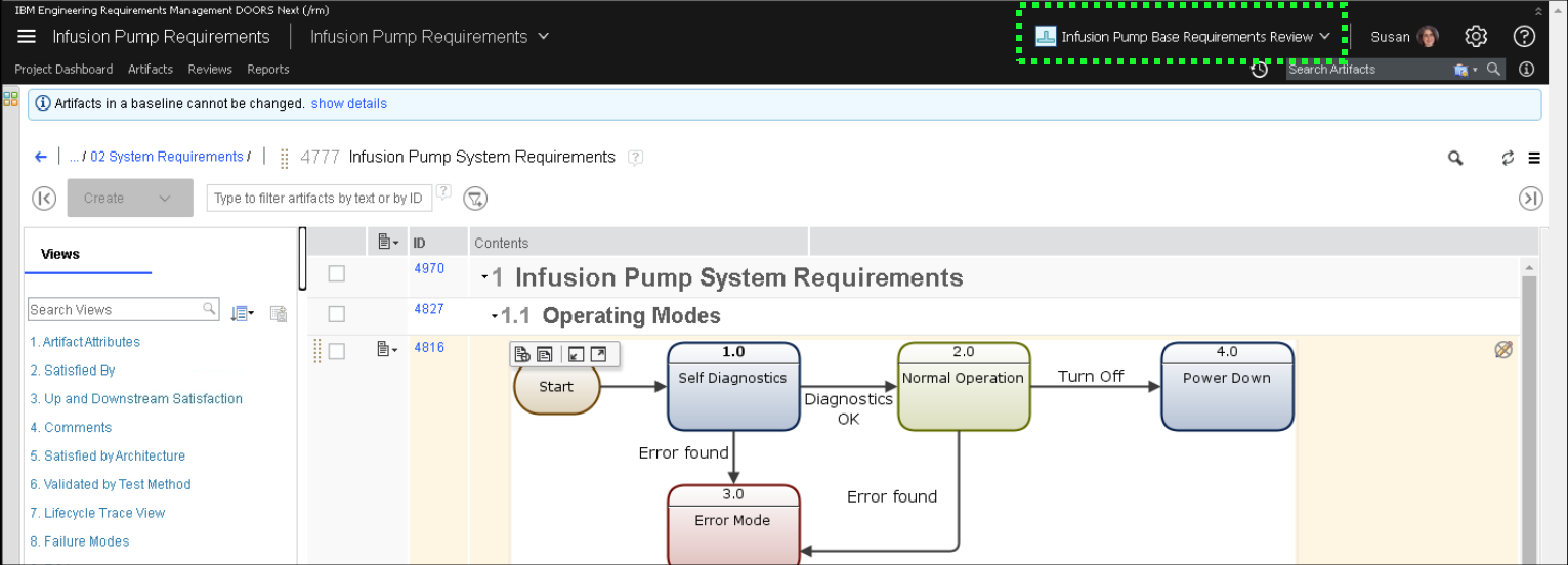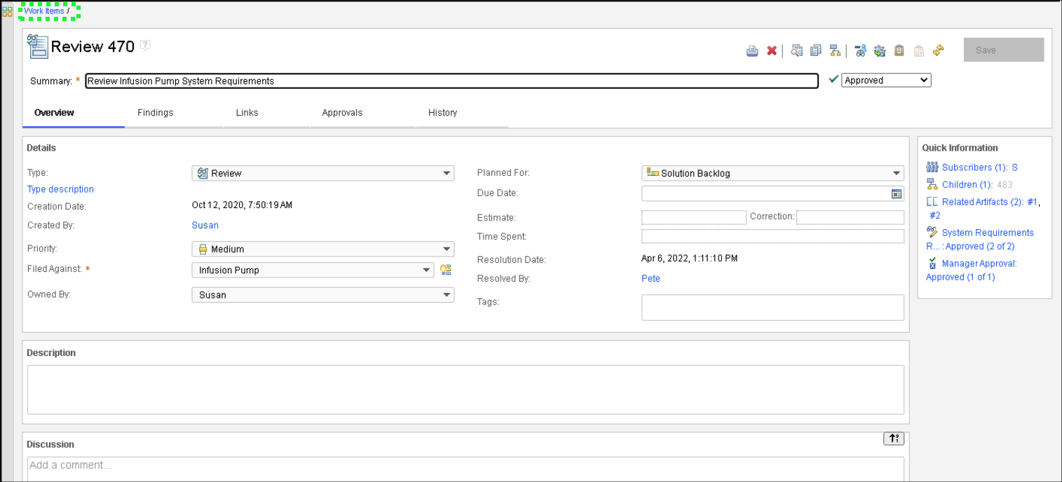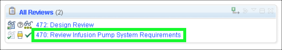 Note that the 470: Review Infusion Pump System Requirements is already complete (green checkbox). In a real project a quality review would be performed before baselining requirements and before entering a review cycle.