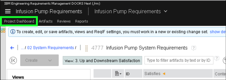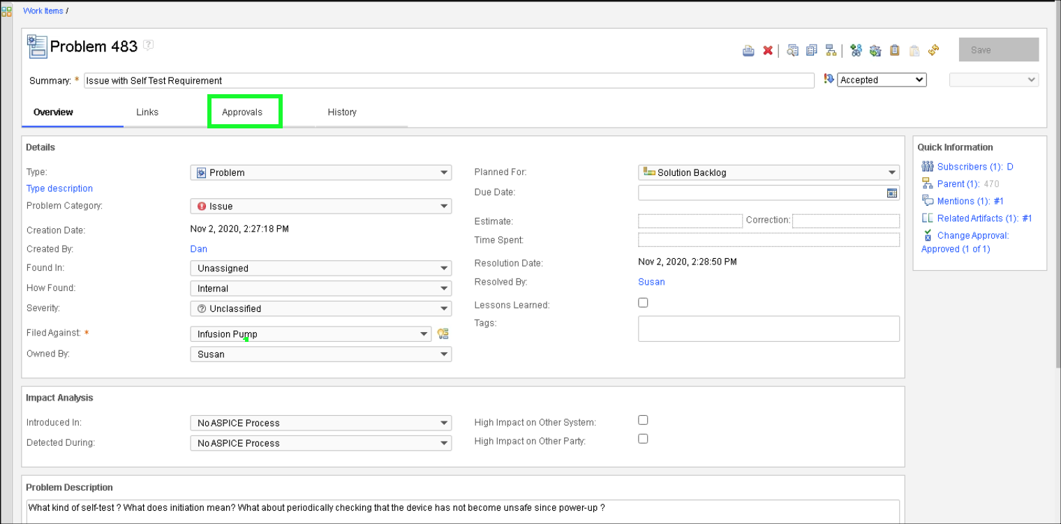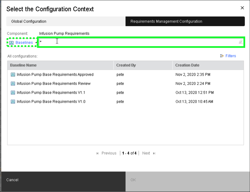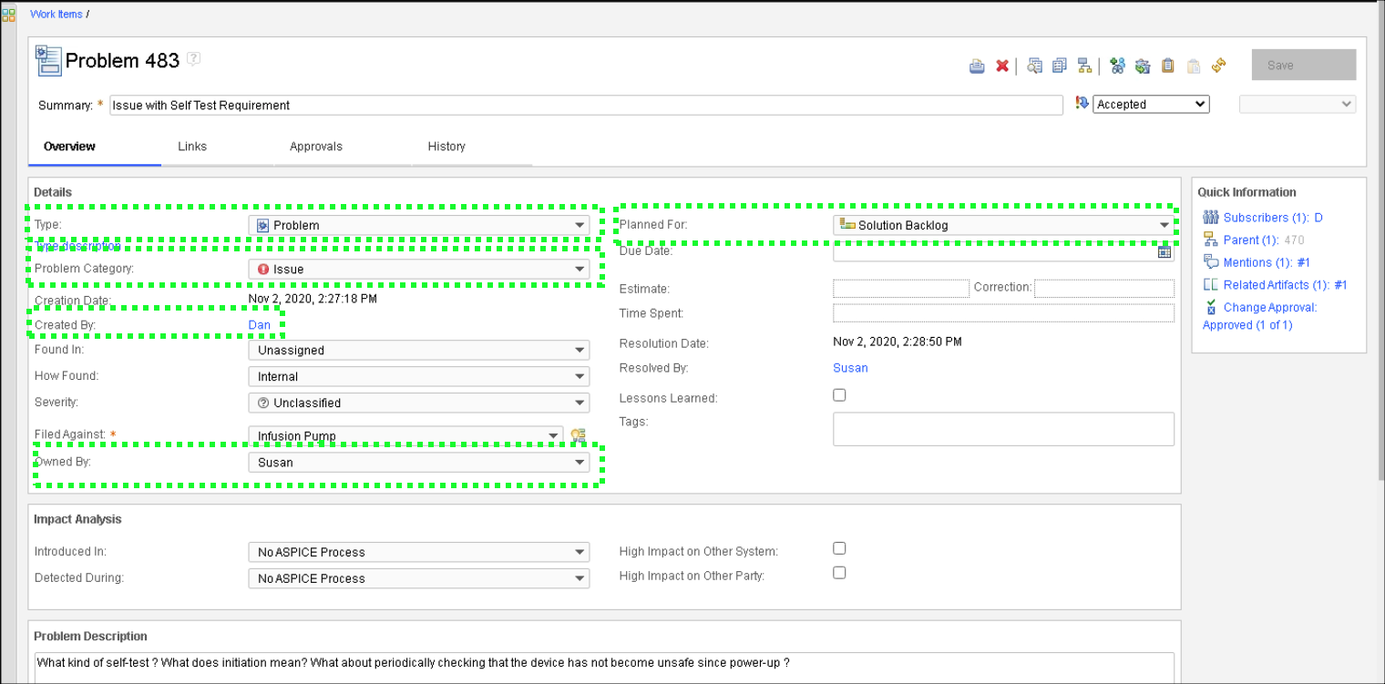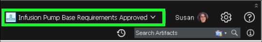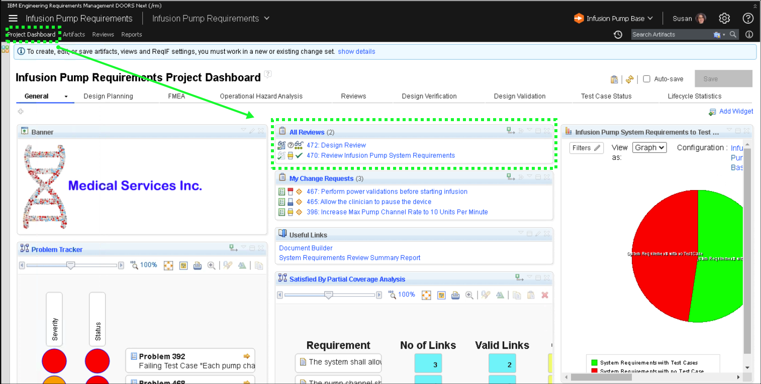 Note that the 470: Review Infusion Pump System Requirements is already complete (green checkbox). In a real project a quality review would be performed before baselining requirements and before entering a review cycle.