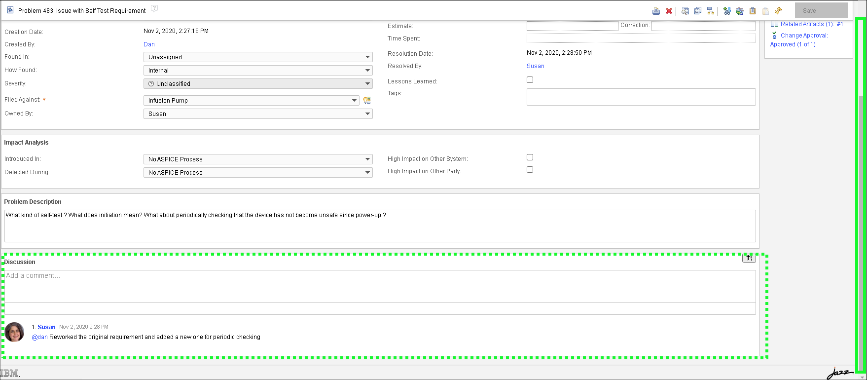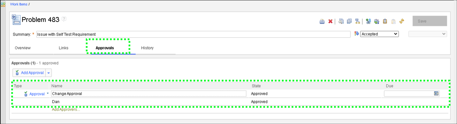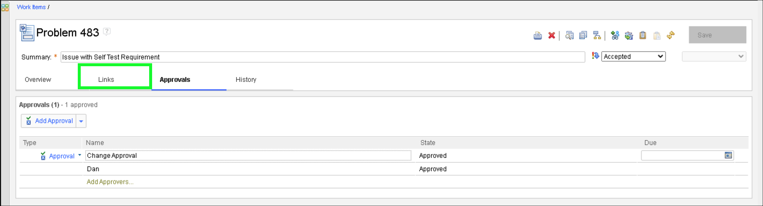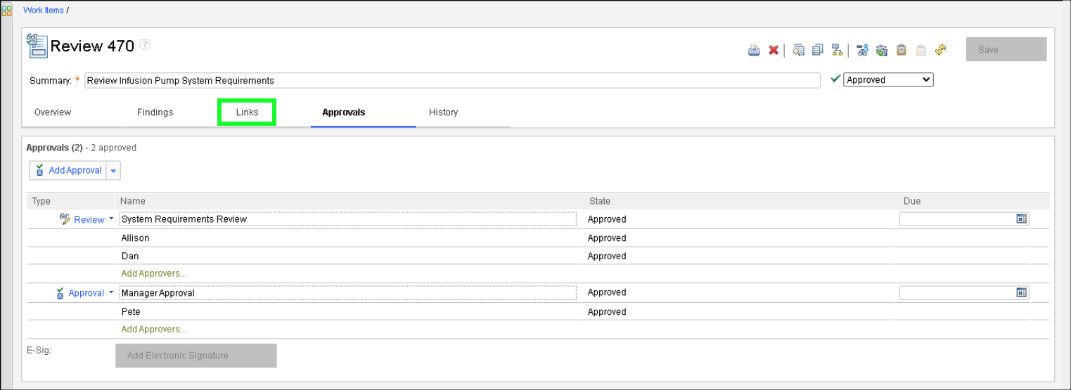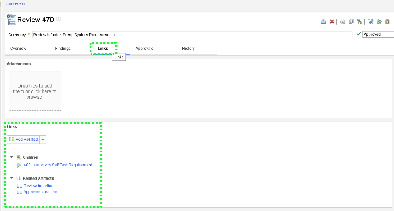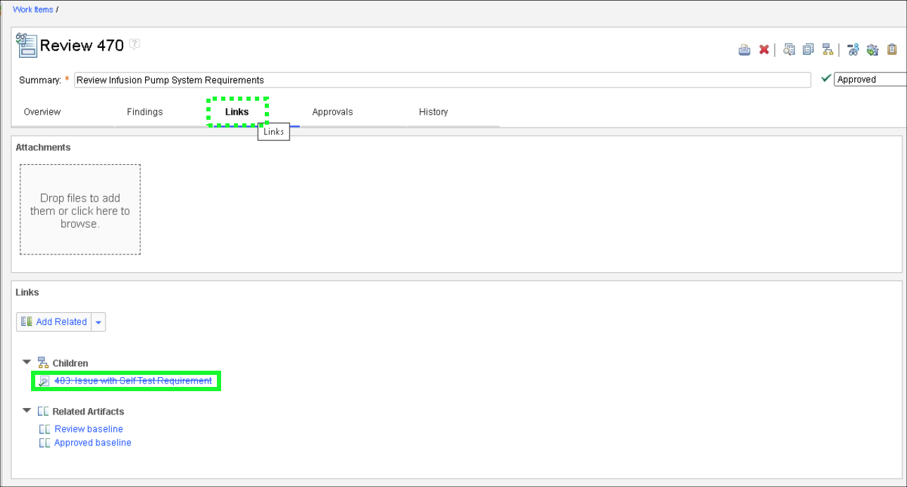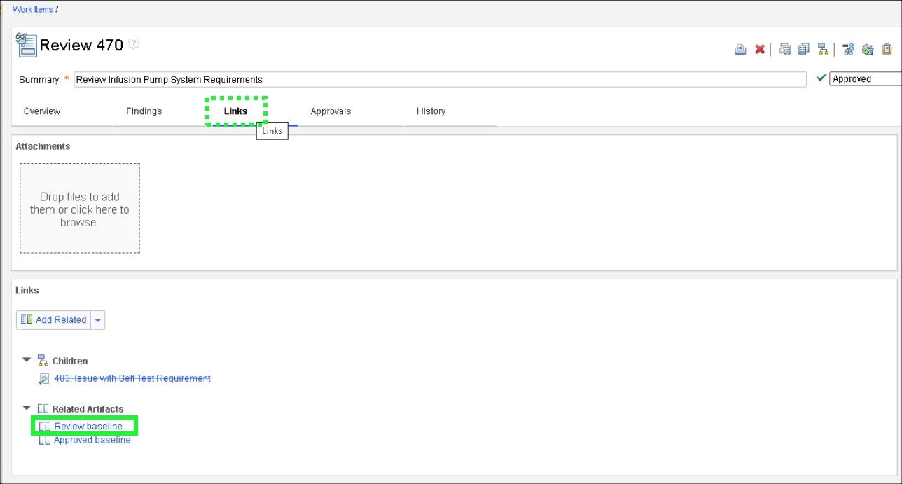 Note that there are links to the baseline of the requirements the review was created against, another link to the final approved baseline (created after the review), and a link to a child work item (this was a problem identified during the review).