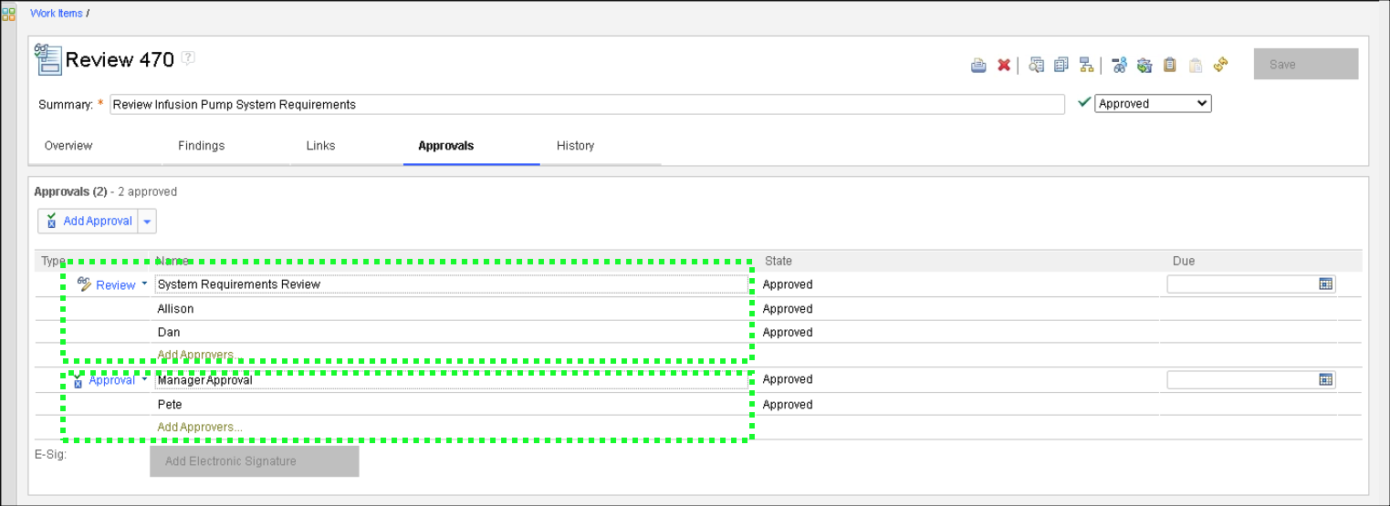 The Review also has electronic signatures, both for the Approval and the final state change to Approved. This only appears in the History of the Review work item. Feel free to show that before showing Risk Management (found in the next chapter of this Act). The project dashboard also has a Reviews tab showing reports and summaries of Reviews.