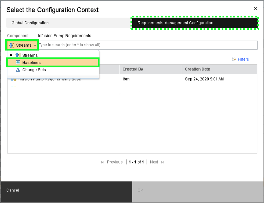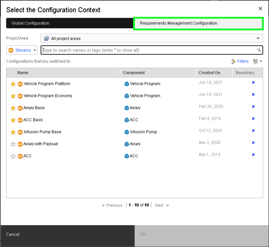 - Click the Requirements Management Configuration tab in the Configuration Context dialog.