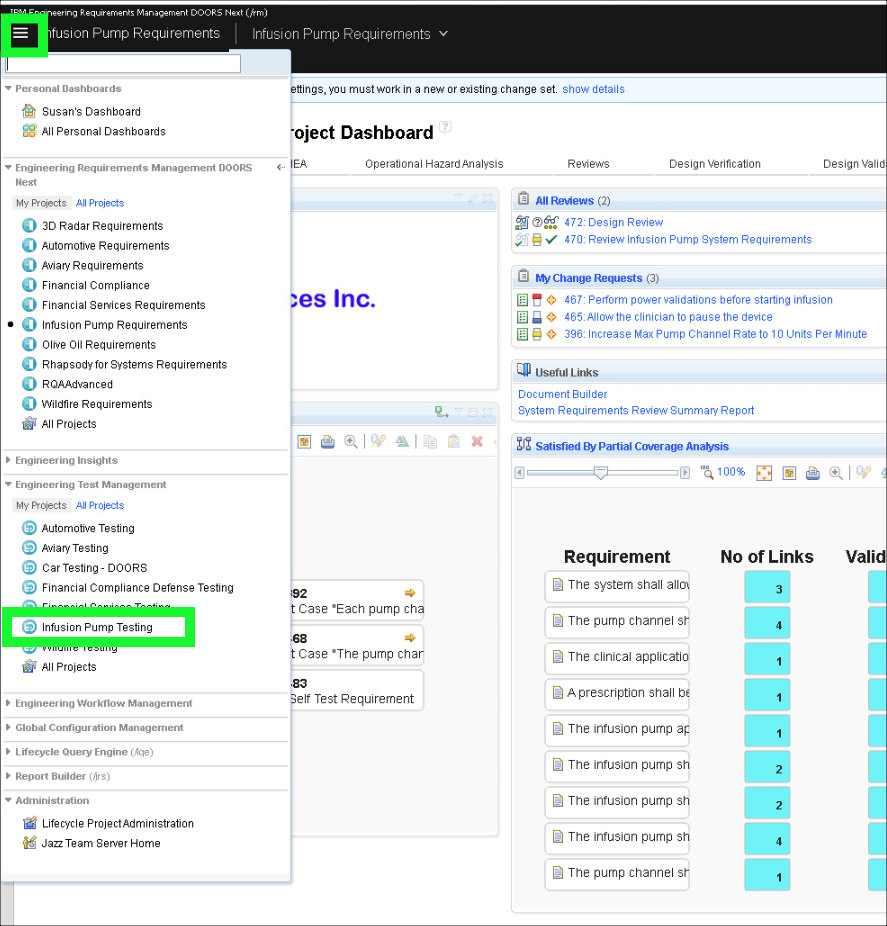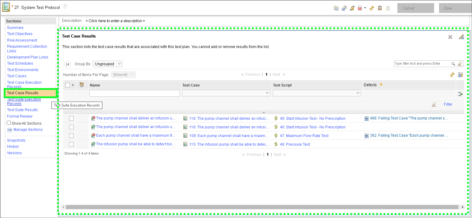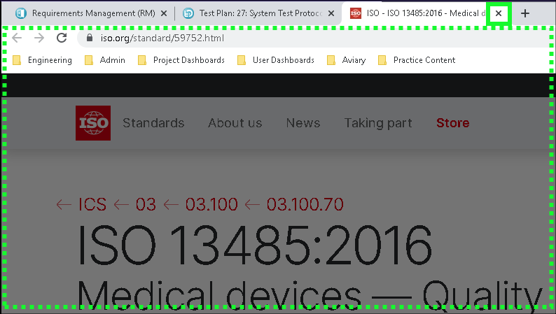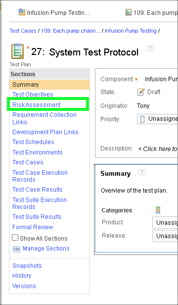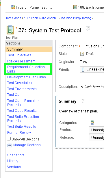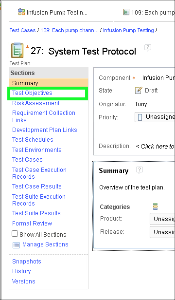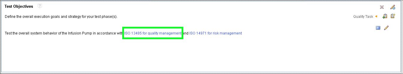 - Click the ISO 13485 for quality management link in the Test Objectives widget.