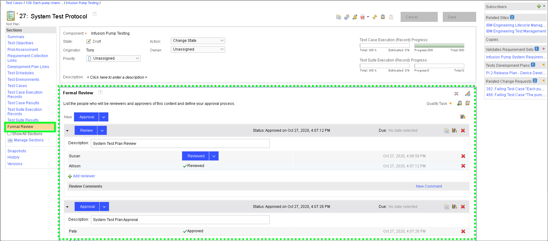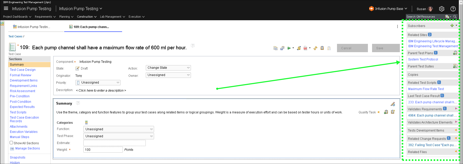 Engineering Test Management (ETM) provides a collaborative hub for systems and software quality across virtually any platform and type of testing. Teams can collaborate and share information easily and seamlessly. Here for example, a tester can see the requirement they are testing without the need to open the requirements tool or refer to a spreadsheet. Test Plans, Test Cases, Test Scripts are all traced to developments, requirements, and designs really help when you’re trying to prove compliance to industry standards.