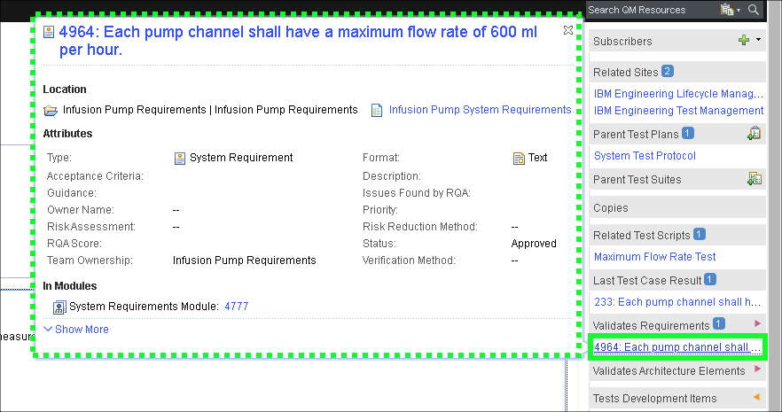 - Hover the the mouse over the linked requirement to show rich hover information.