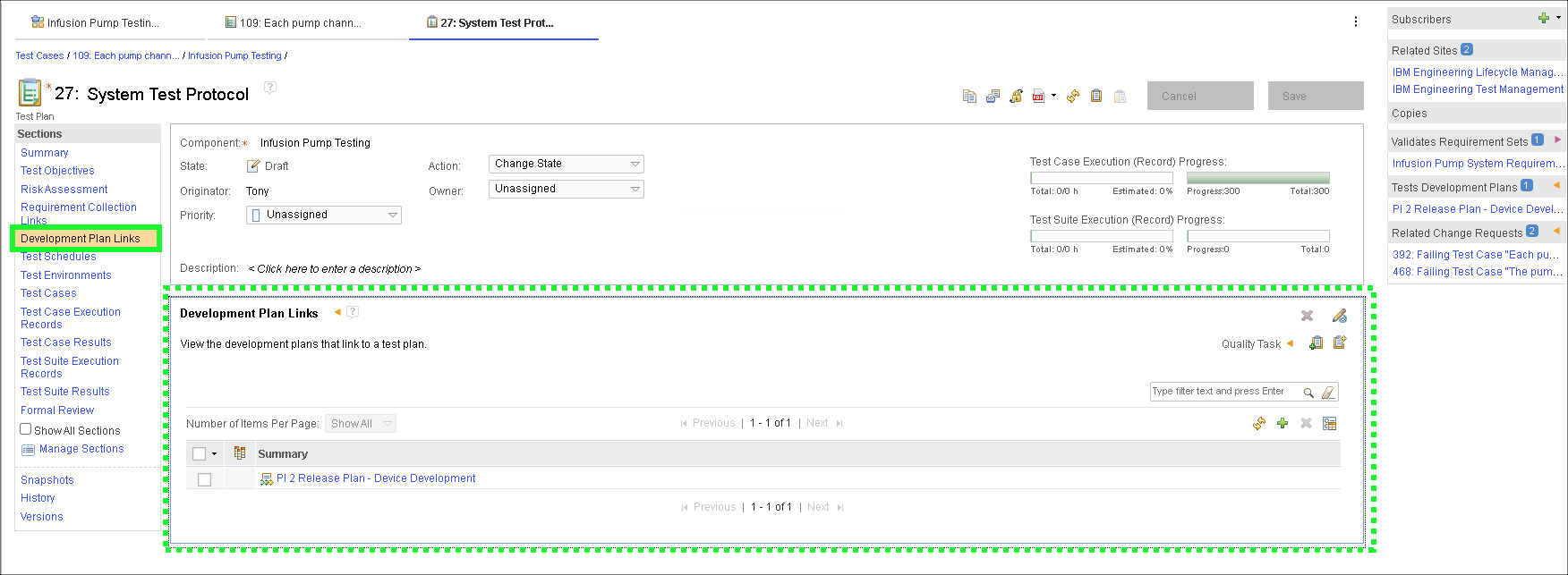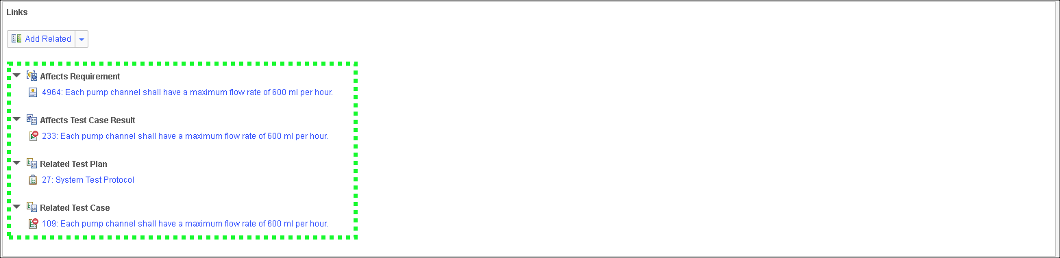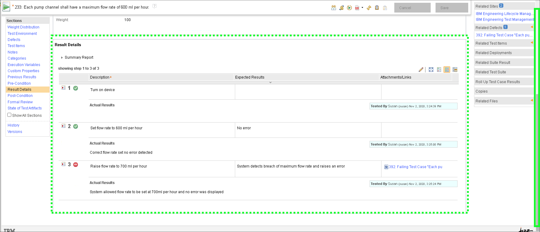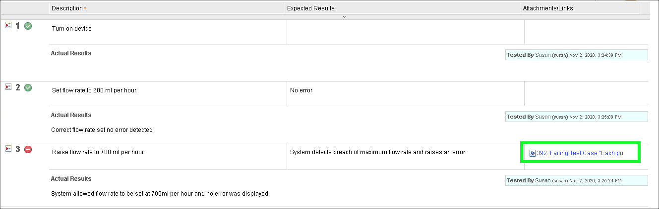 - Notice the linked test cases, link validity, and also the current status of the linked text case execution.