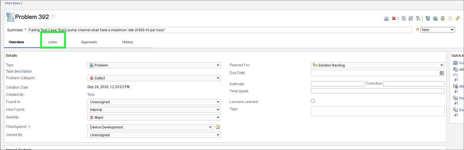Notice this test case is part of a Test Plan and that it validates a requirement. It has a related test script, a link to the most recent test execution result, and also a linked defect which was raised when the last test execution failed.