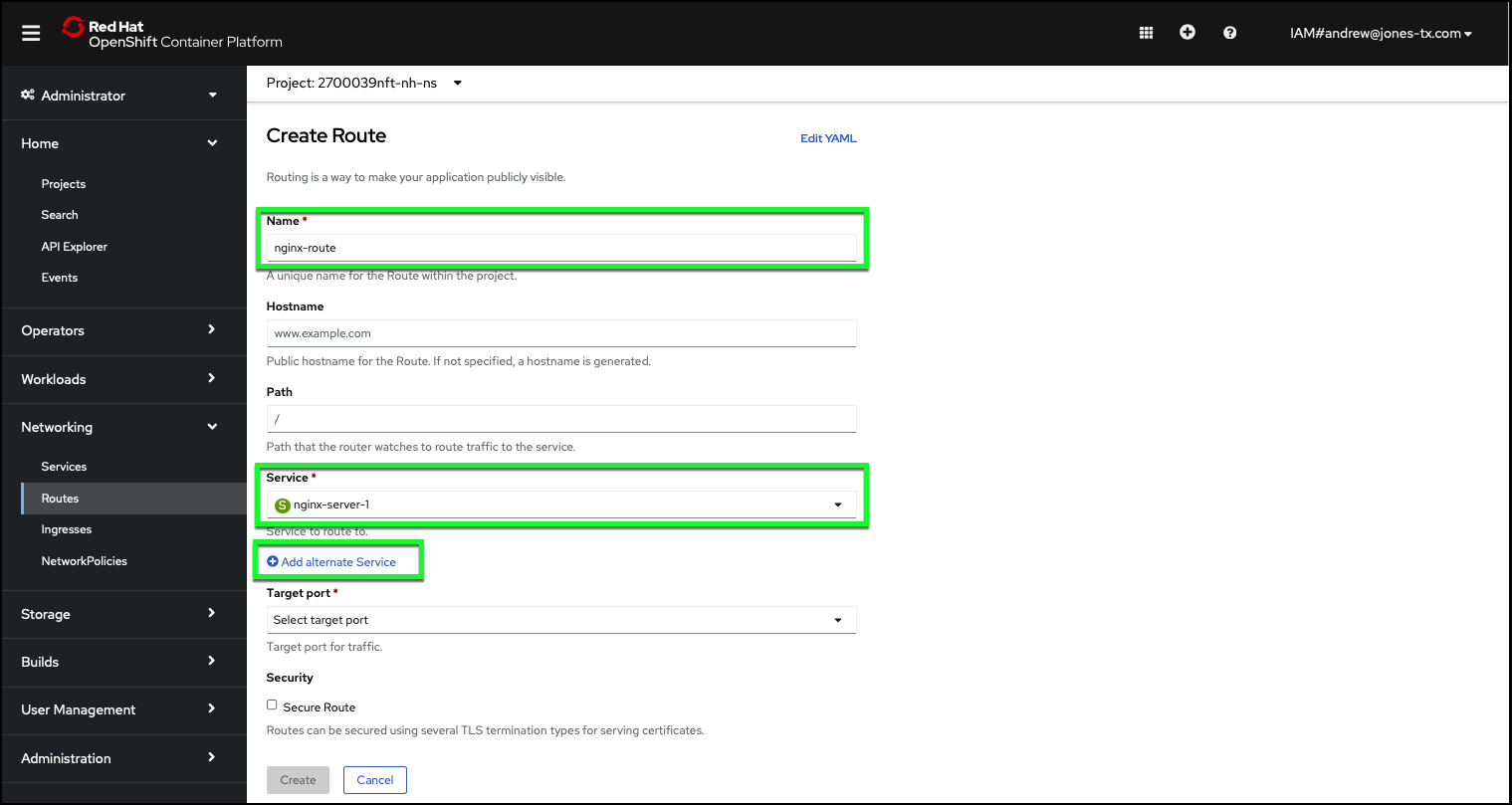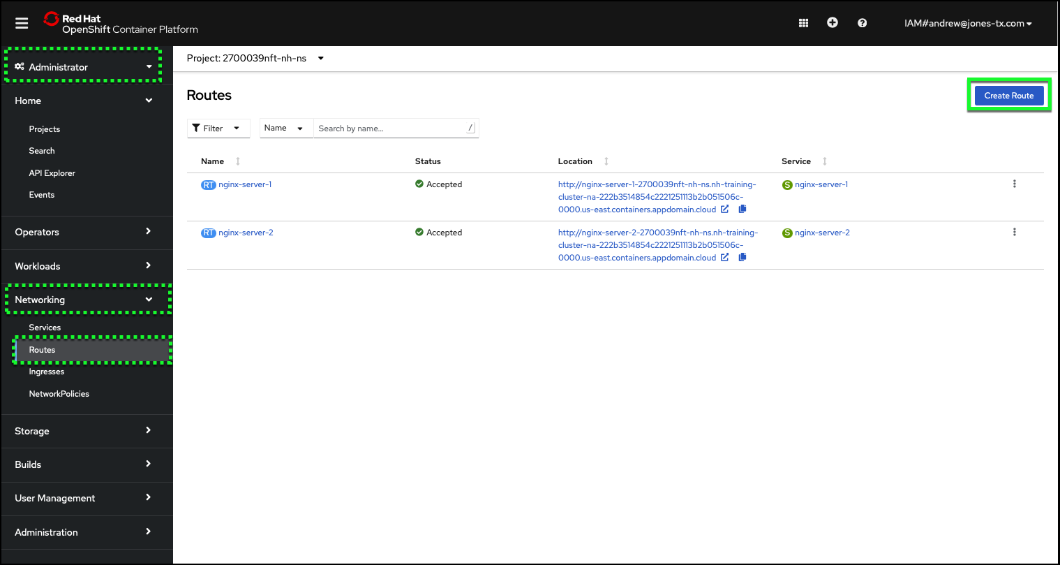 On this screen you can see the defaults routes that were automatically created when you deployed the NGINX container. Next, we will create a new route that will balance incoming requests to both of the NGINX servers.
