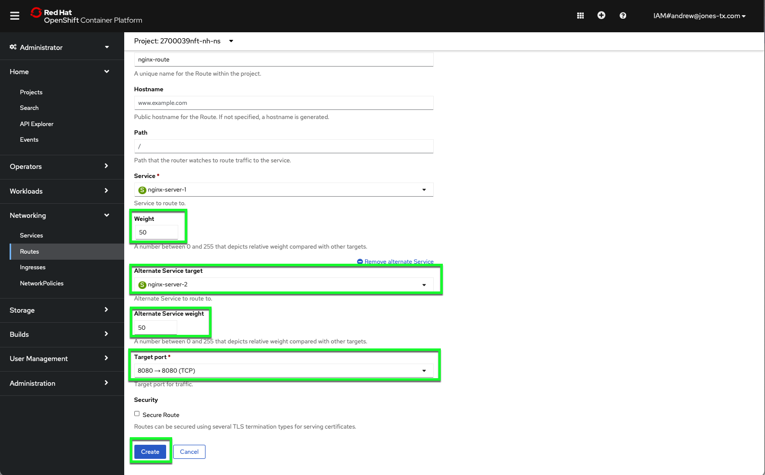 In this section, you will create a route to balance network traffic between our two deployed applications.