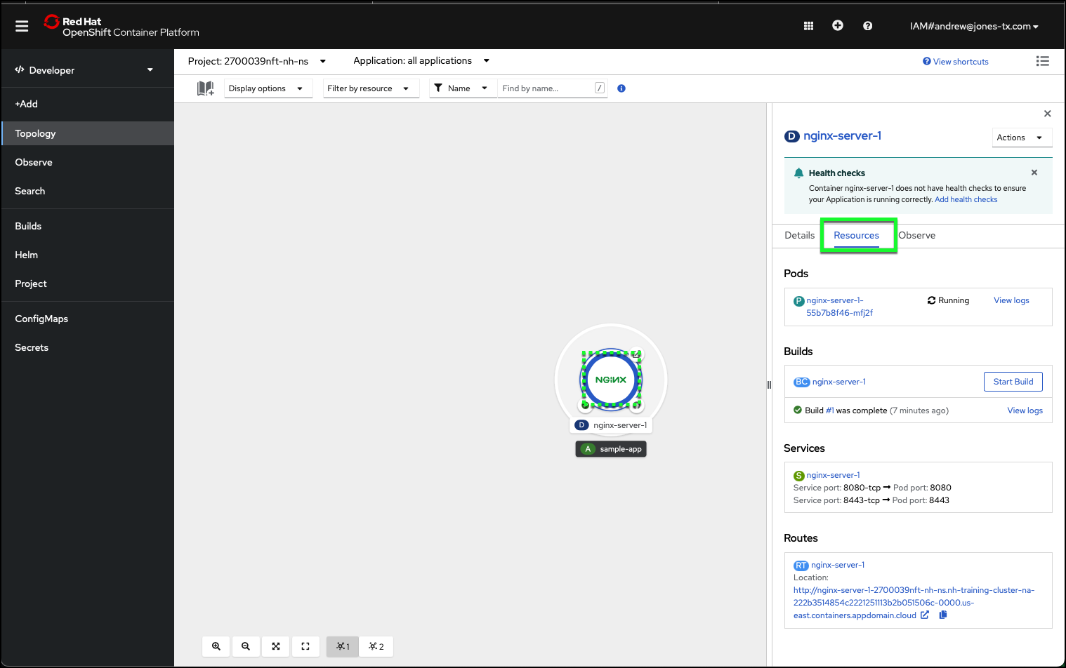 The OpenShift web console provides valuable information about the status of everything running in the OpenShift cluster. In the next section, learn how to access some of the information about the NGINX container image you just deployed.