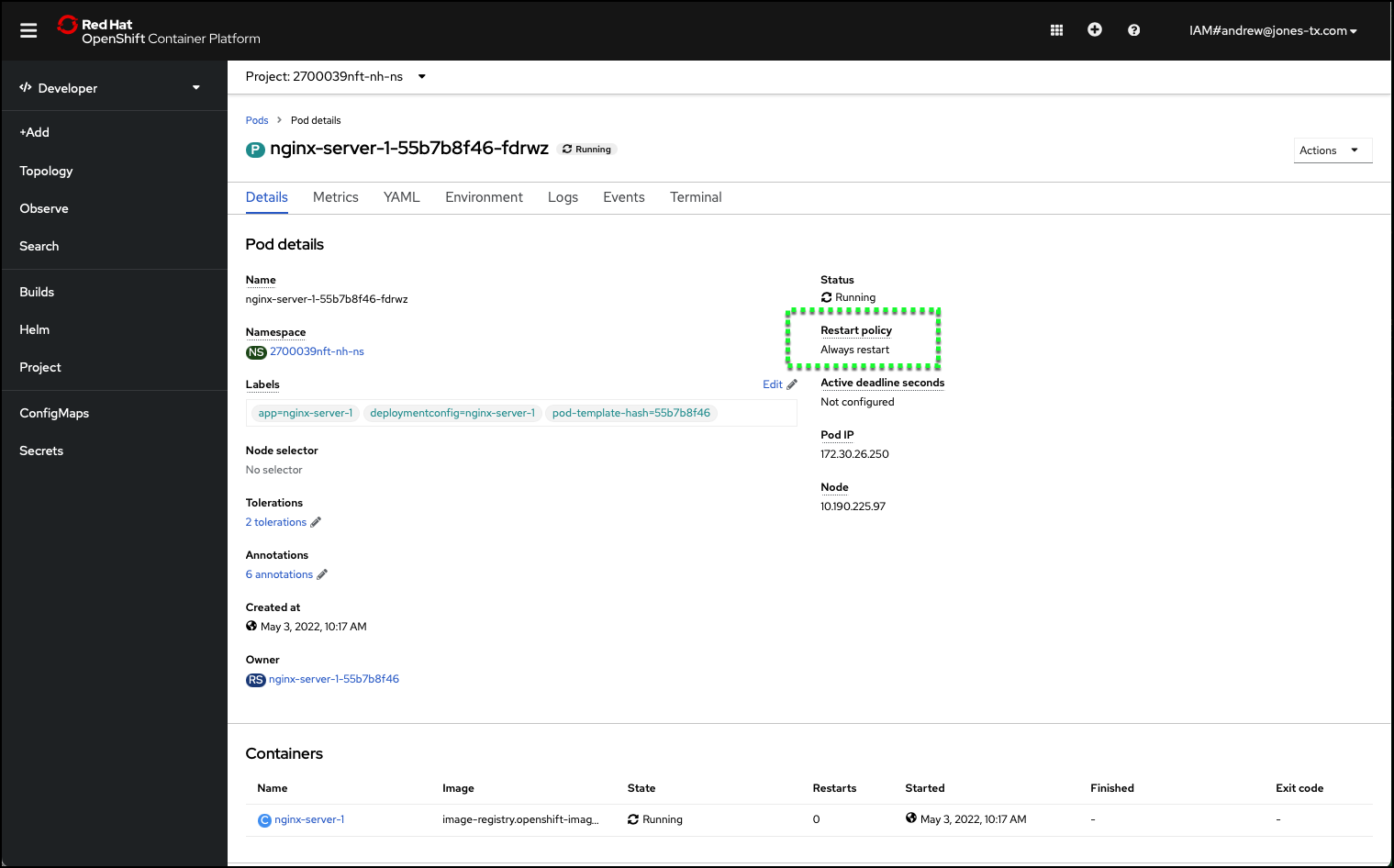 - Scroll down the Details tab and record the Restart Policy for the pod.