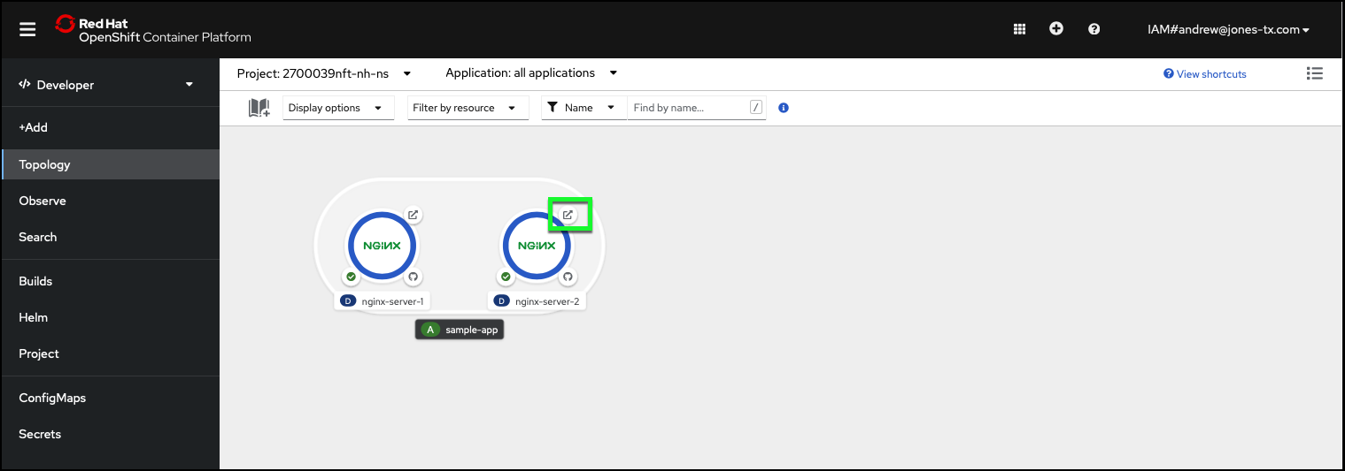 - Click the Open URL button on the edge of the nginx-server-2 deployment icon. This will launch as a new tab or window in your web browser. You should now see the default page for the web server displays the new message: NGINX Server 2 works!