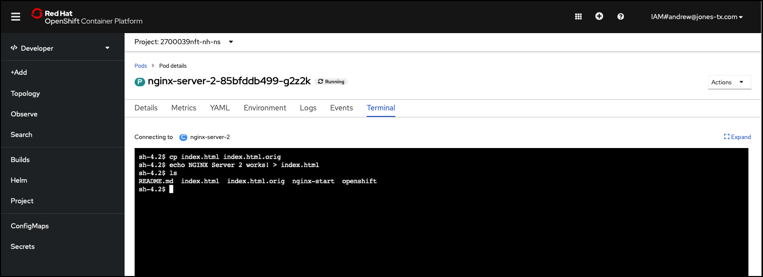sh-4.2$ cp index.html index.html.orig sh-4.2$ echo NGINX Server 1 works! > index.html sh-4.2$ ls README.md index.html index.html.orig nginx-start openshift sh-4.2$