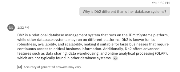 Responses generated by IBM watsonx Assistant for Z are likely to change over time. The responses you see when you run the queries in this section may differ from the screen images captured in the IBM watsonx Assistant for Z for Technical Sales Level 3 Demonstration Guide. Using the exact queries specified will help assure a successful demonstration. Also, as updates to the environment are made, some confirmation dialogs may no longer be displayed as illustrated in the Example outputs.