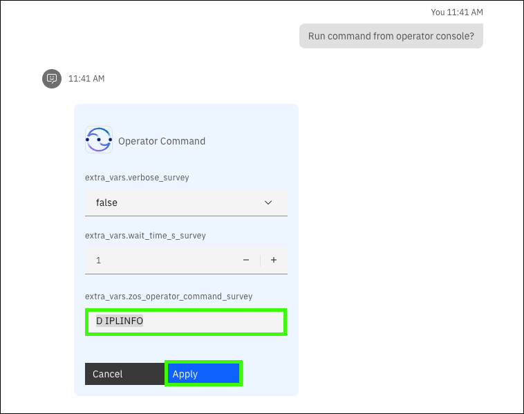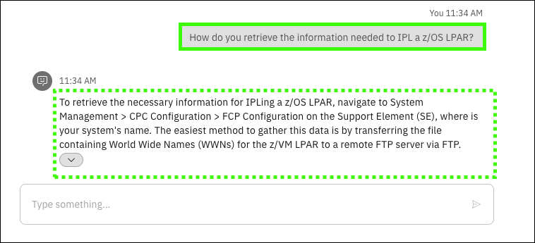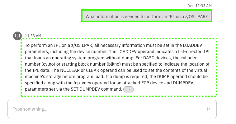 You are now a Systems Programmer (sysprog) that is preparing for an upcoming Initial Programming Load (IPL) scheduled for one of your IBM Z systems. It’s been a while since you helped prepare for an IPL and you want to refamiliarize yourself with this process. Rather than spending time reading through the wide array of documentation available online, you leverage the conversational AI capabilities provided by IBM watsonx Assistant for Z to get accurate responses to your questions quickly, along with step-by-step guidance and links to documentation to learn more. When asking the assistant “How to perform an IPL on IBM Z?”, you realize there’s some information needed about your system; for example, the IPL volume and the IPL LOAD PARM. The conversational skills capabilities provided by the assistant allows you to issue operator commands on the system directly within the assistant itself, serving as a one-stop shop for retrieving details required for the IPL process to go smoothly and increasing efficiency.