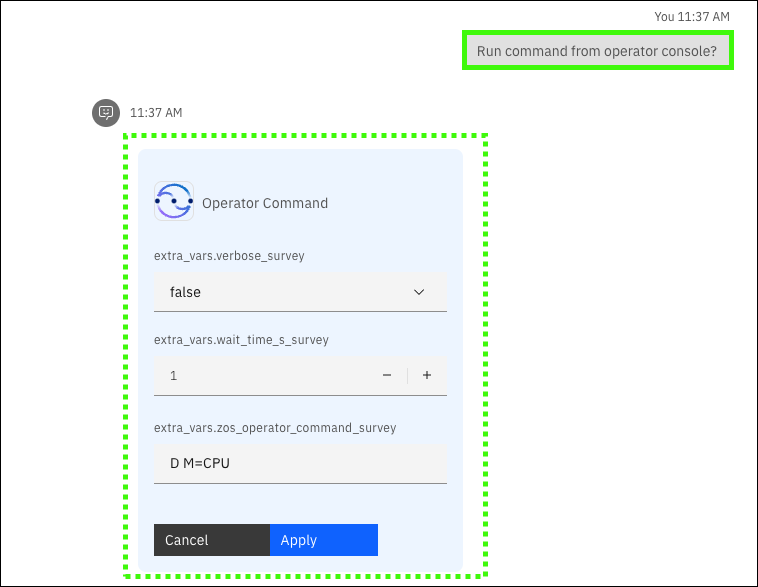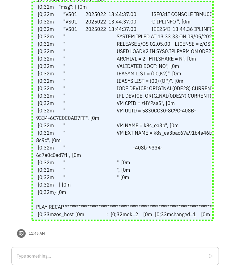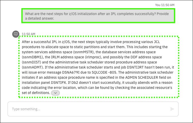 Responses generated by IBM watsonx Assistant for Z are likely to change over time. The responses you see when you run the queries in this section may differ from the screen images captured in the IBM watsonx Assistant for Z for Technical Sales Level 3 Demonstration Guide. Using the exact queries specified will help assure a successful demonstration. Also, as updates to the environment are made, some confirmation dialogs may no longer be displayed as illustrated in the Example outputs.