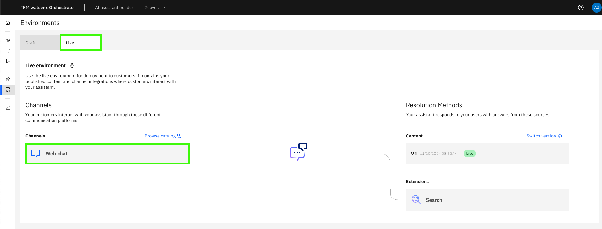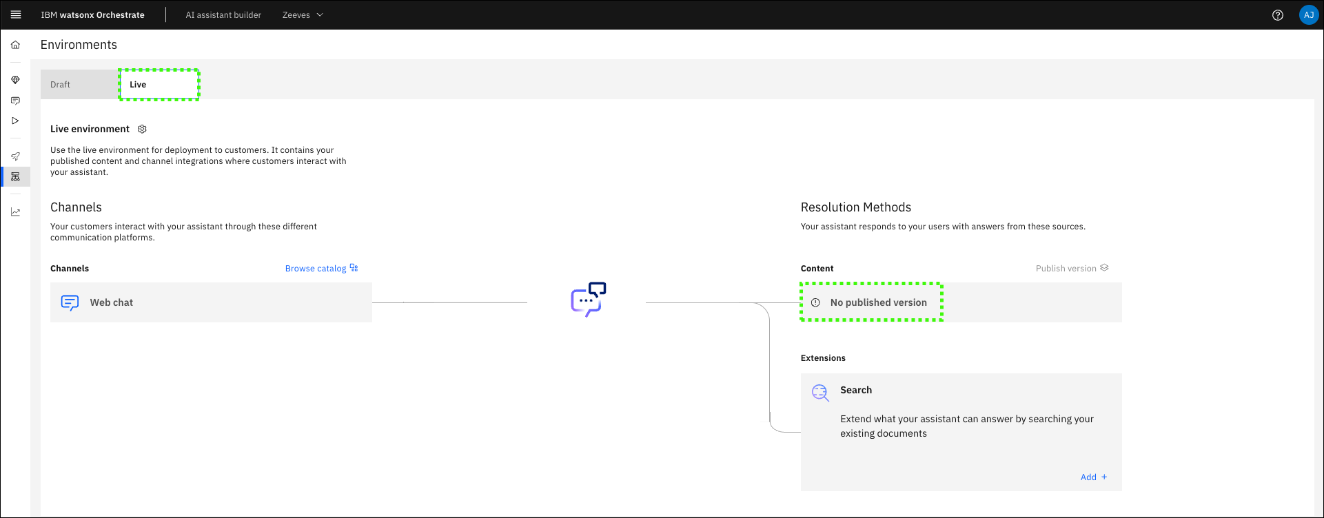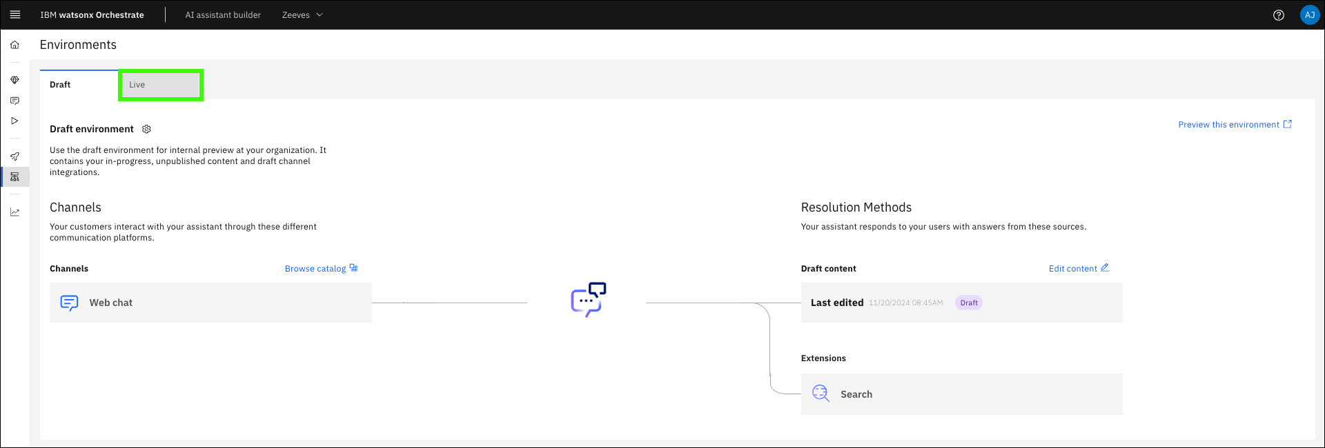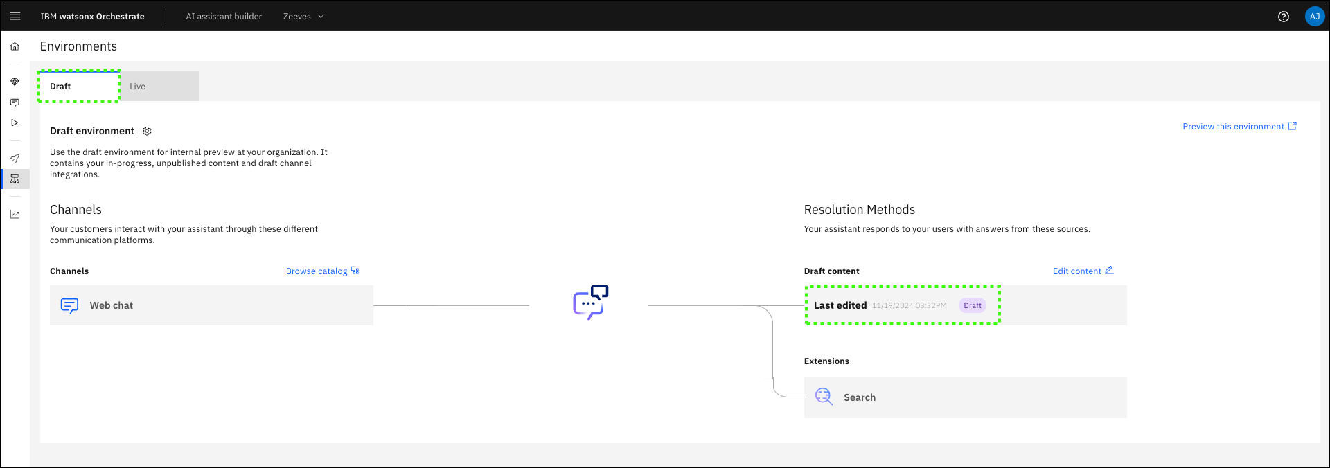 The Draft environment contains all your in-progress work in the Actions, Preview, and Publish pages. Use the Draft environment tab to build out your assistant and use for internal testing before deployment. Any integrations (channels) that you use for the Draft environment are unique to that environment, and changes to draft integrations don’t affect the Live environment.