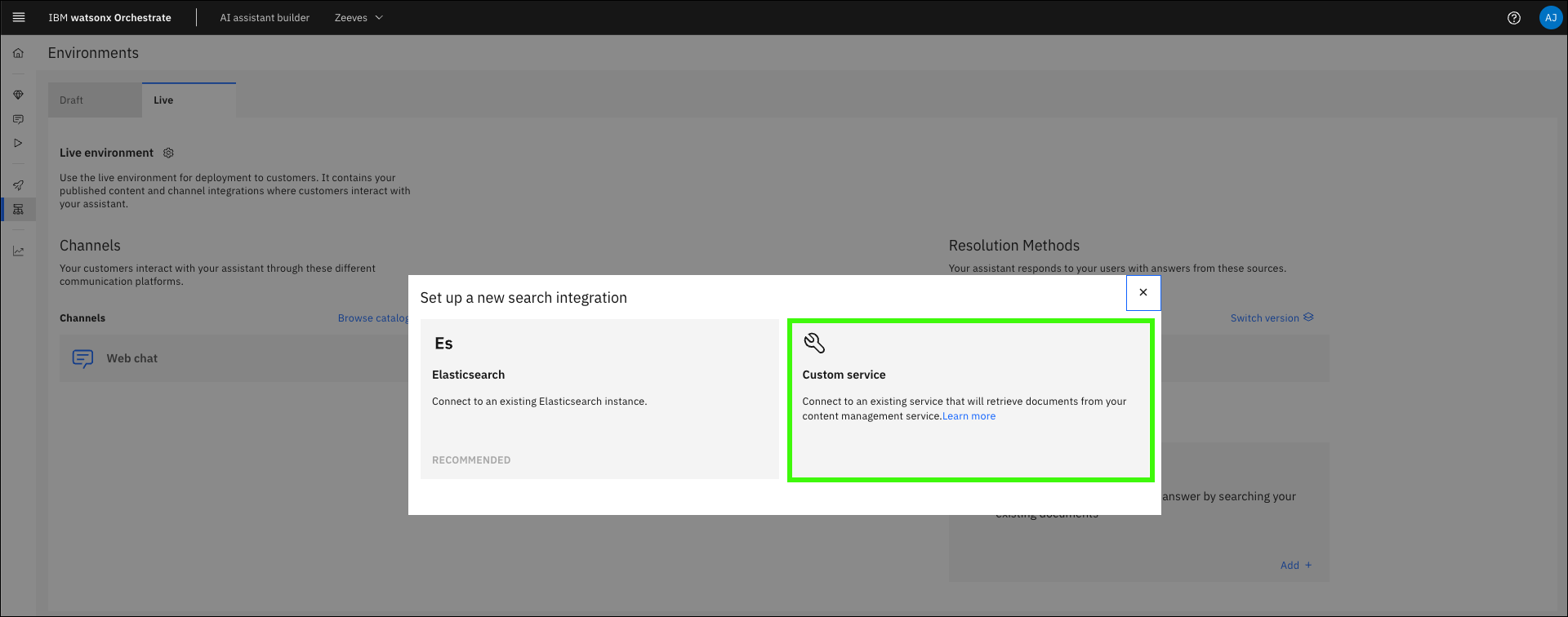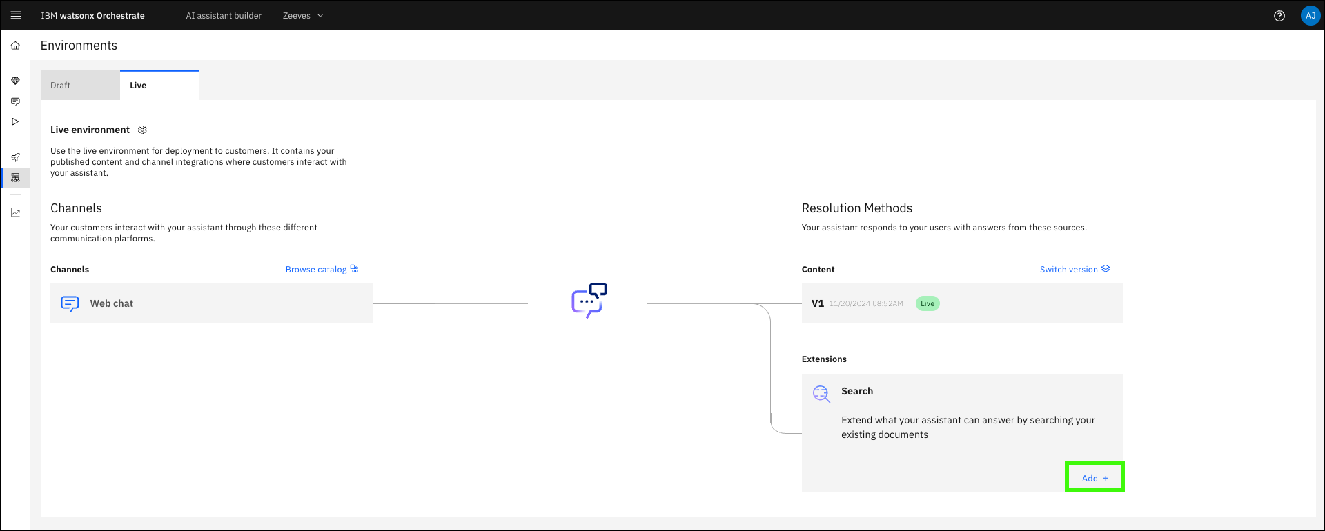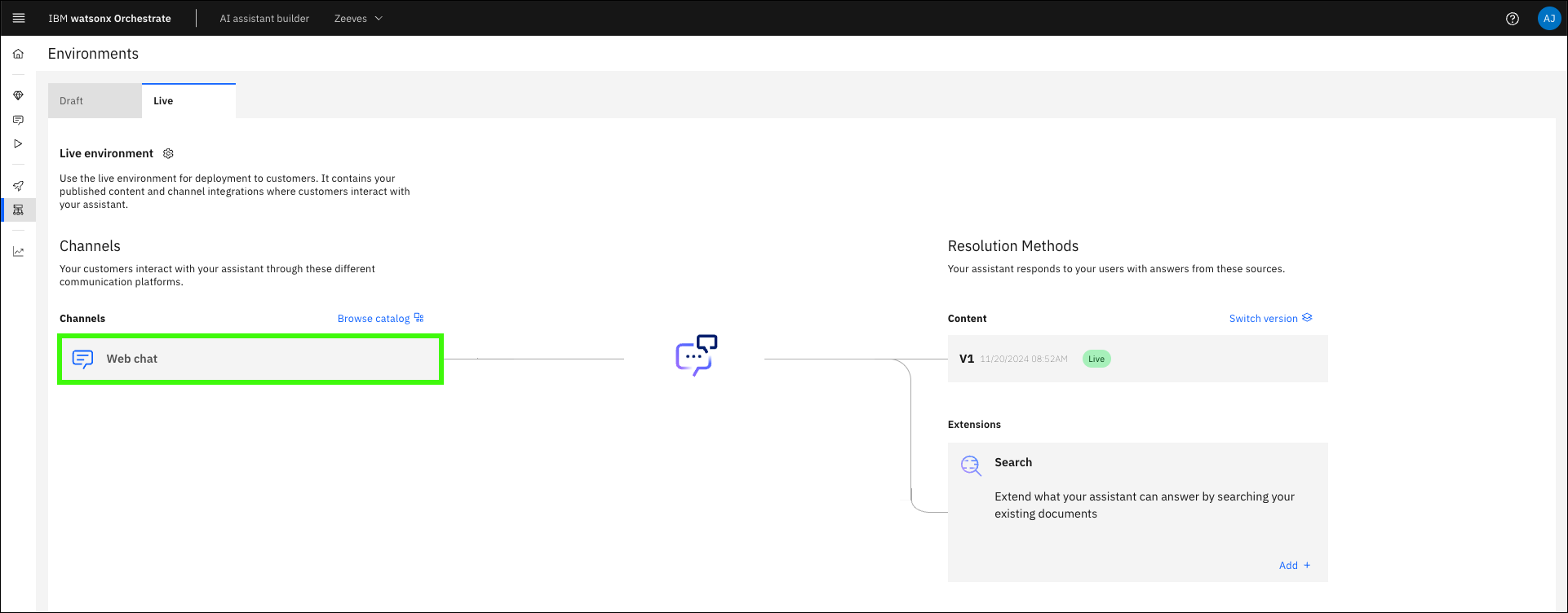 Important: When the live environment is created, the settings from the draft environment are not carried over (for example, the configuration of the OpenSearch instance used for conversational search).
