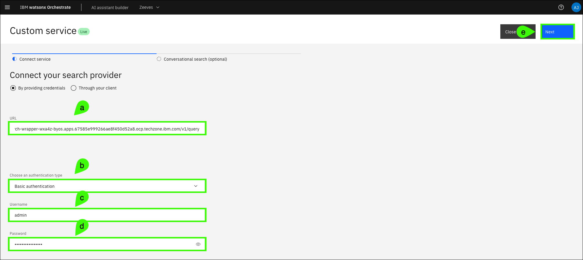 Enter the URL for your bring-your-own-search (BYOS) engine (a), select Basic authentication for the authentication type (b), enter admin for the Username (c), enter the password that you specified in the