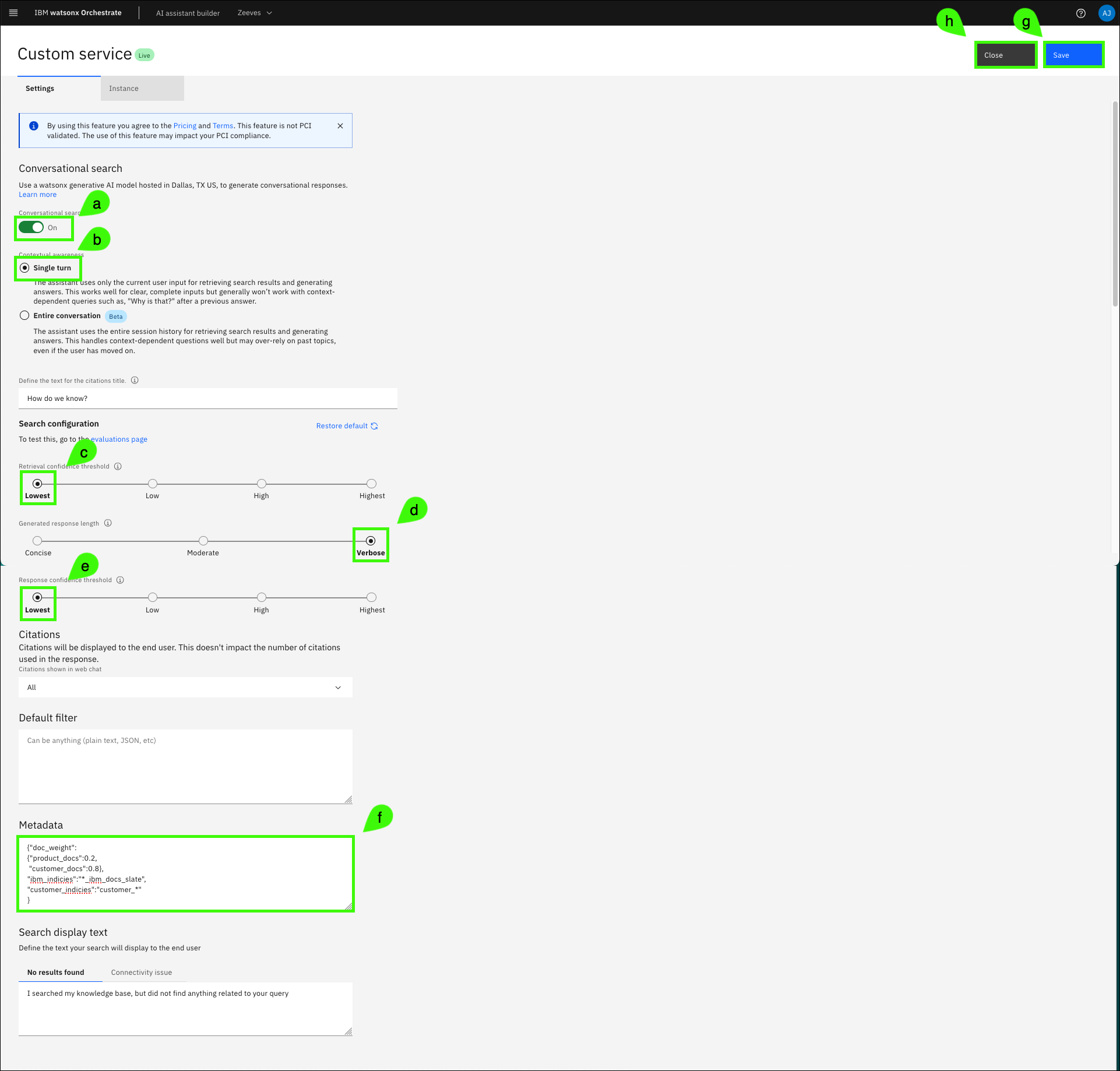 Update the Custom service settings (a-f), click Save (g), and then click Close (h).