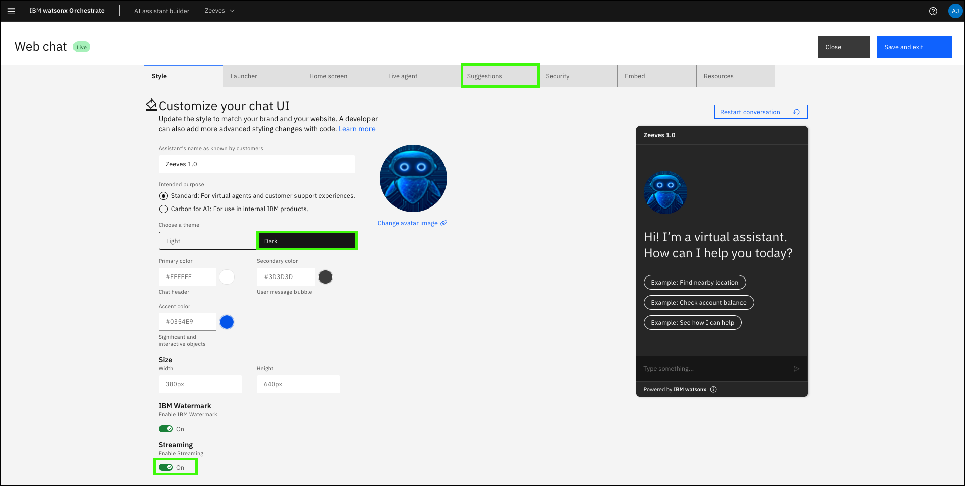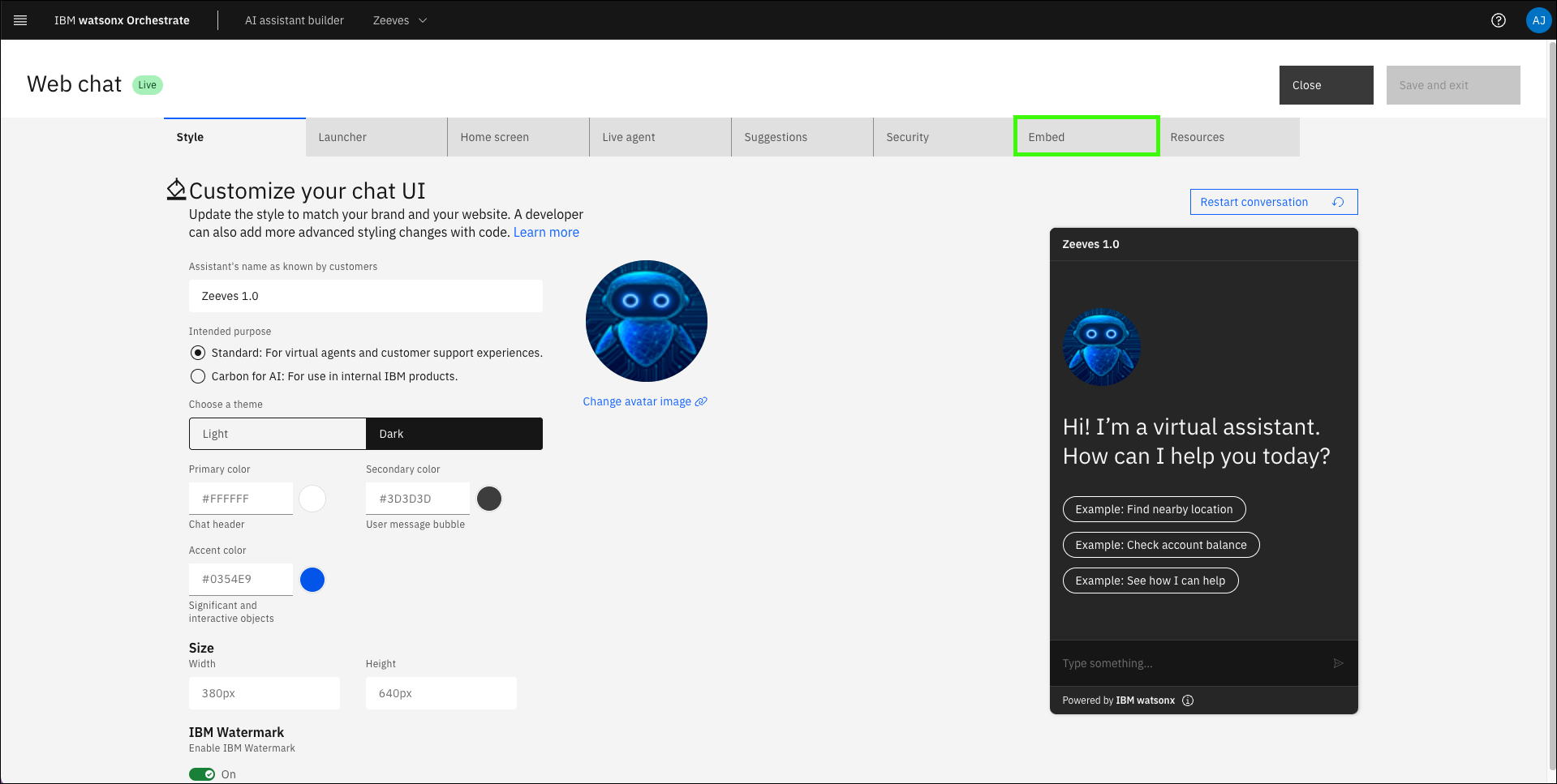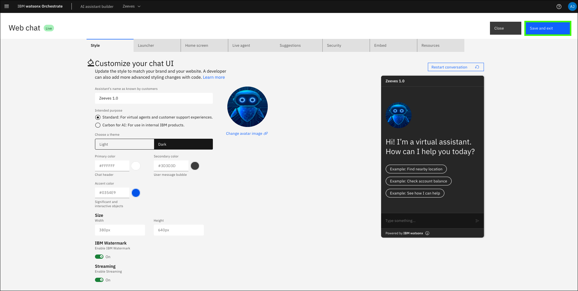 On the Style tab, you’re able to set the Assistant name that is displayed on the chat window when users are interacting with the assistant. For pilots or demos, consider personalizing this name for the client. Also in the Style tab, you can set the themes and display settings of the chat windows, including the ability to enable the IBM Watermark and enable streaming.