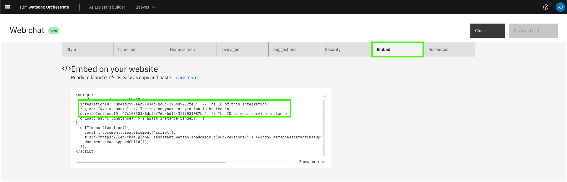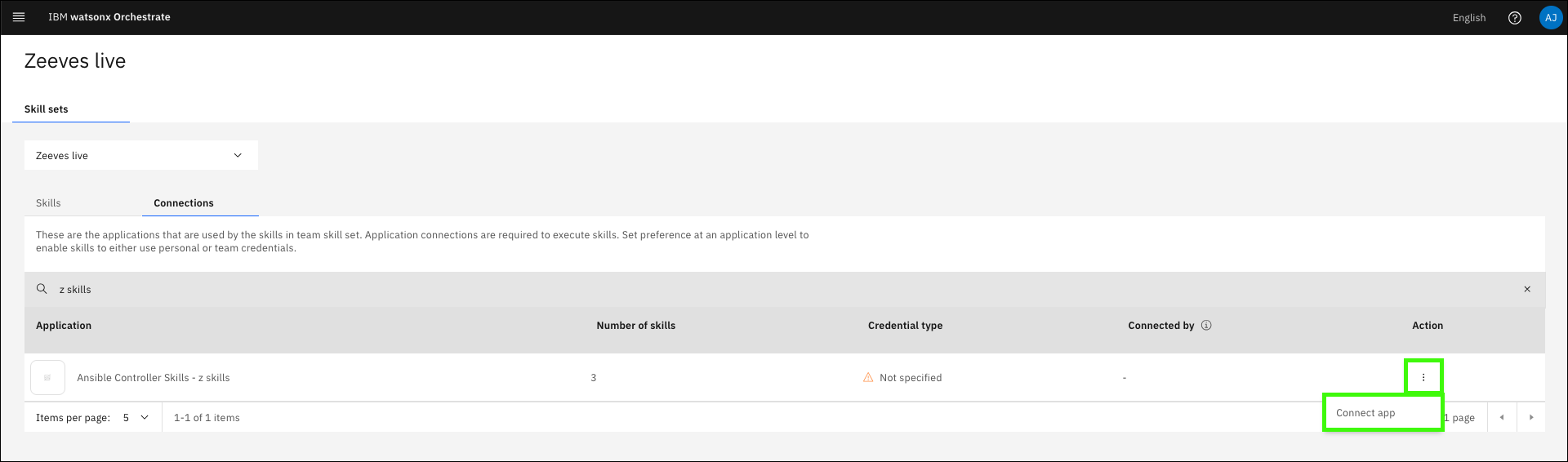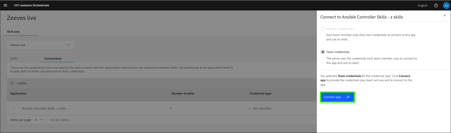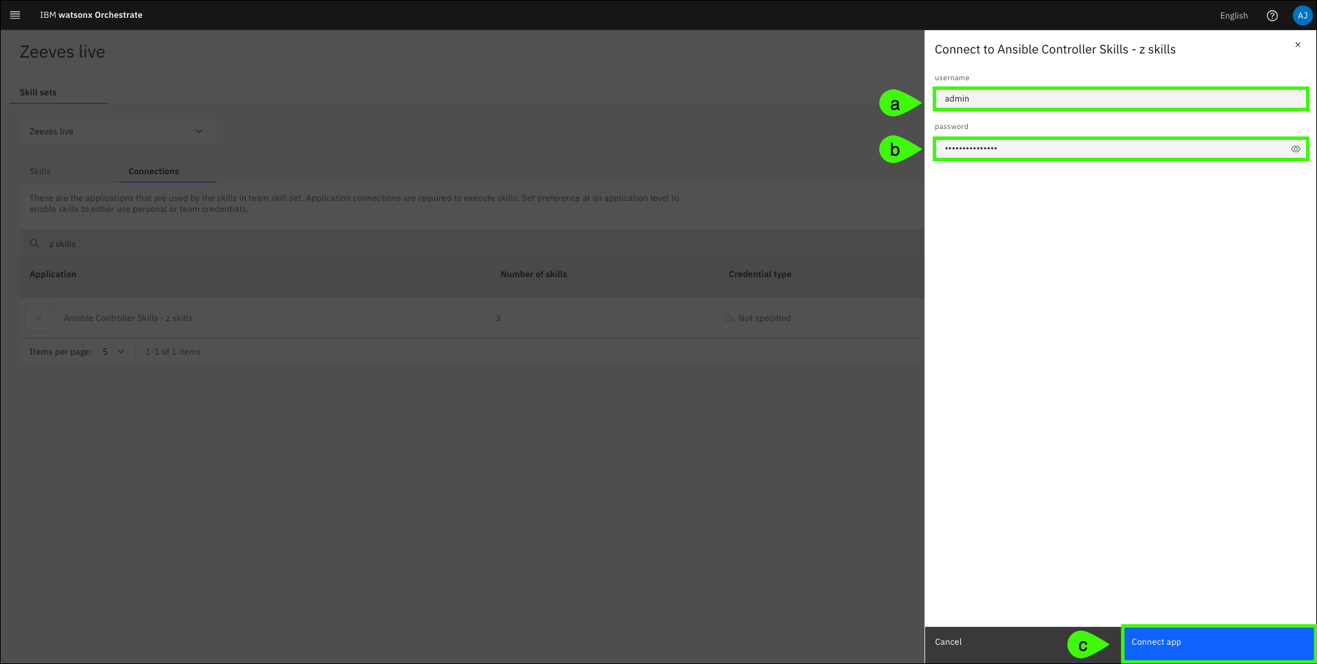 admin) and password for your IBM Technology Zone (ITZ) watsonx Assistant for Z Pilot - AAP & z/OS reservation, and then click Connect app (c).Learn more about publishing your assistant and creating live environments here.