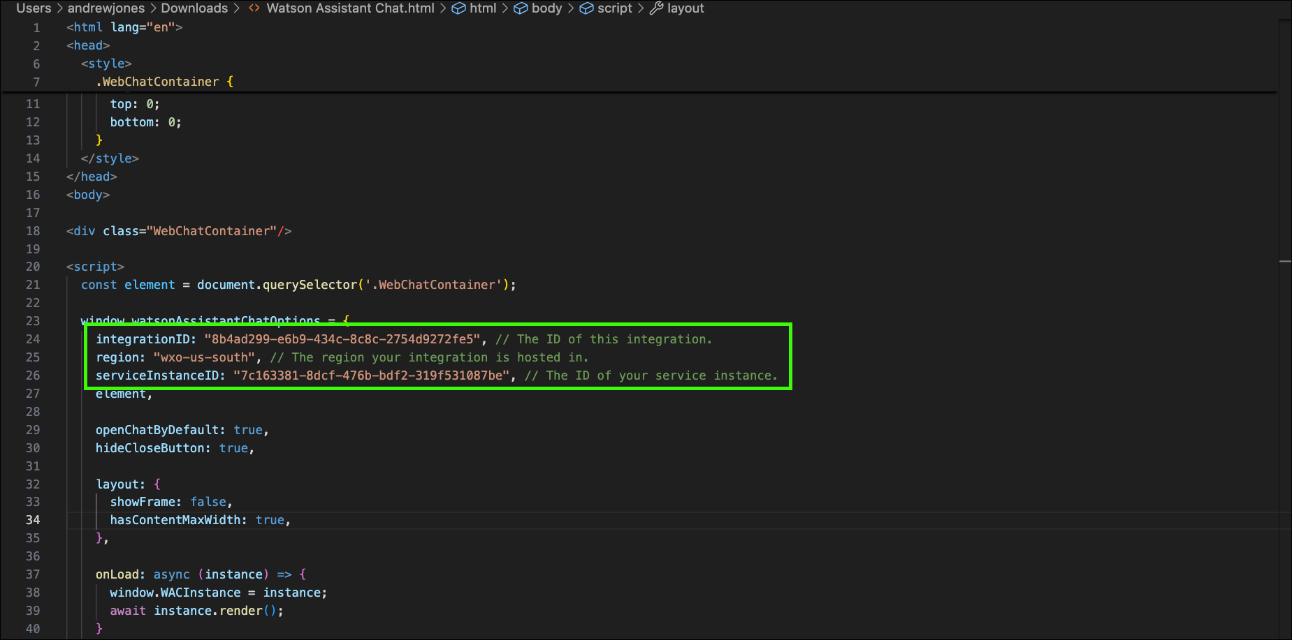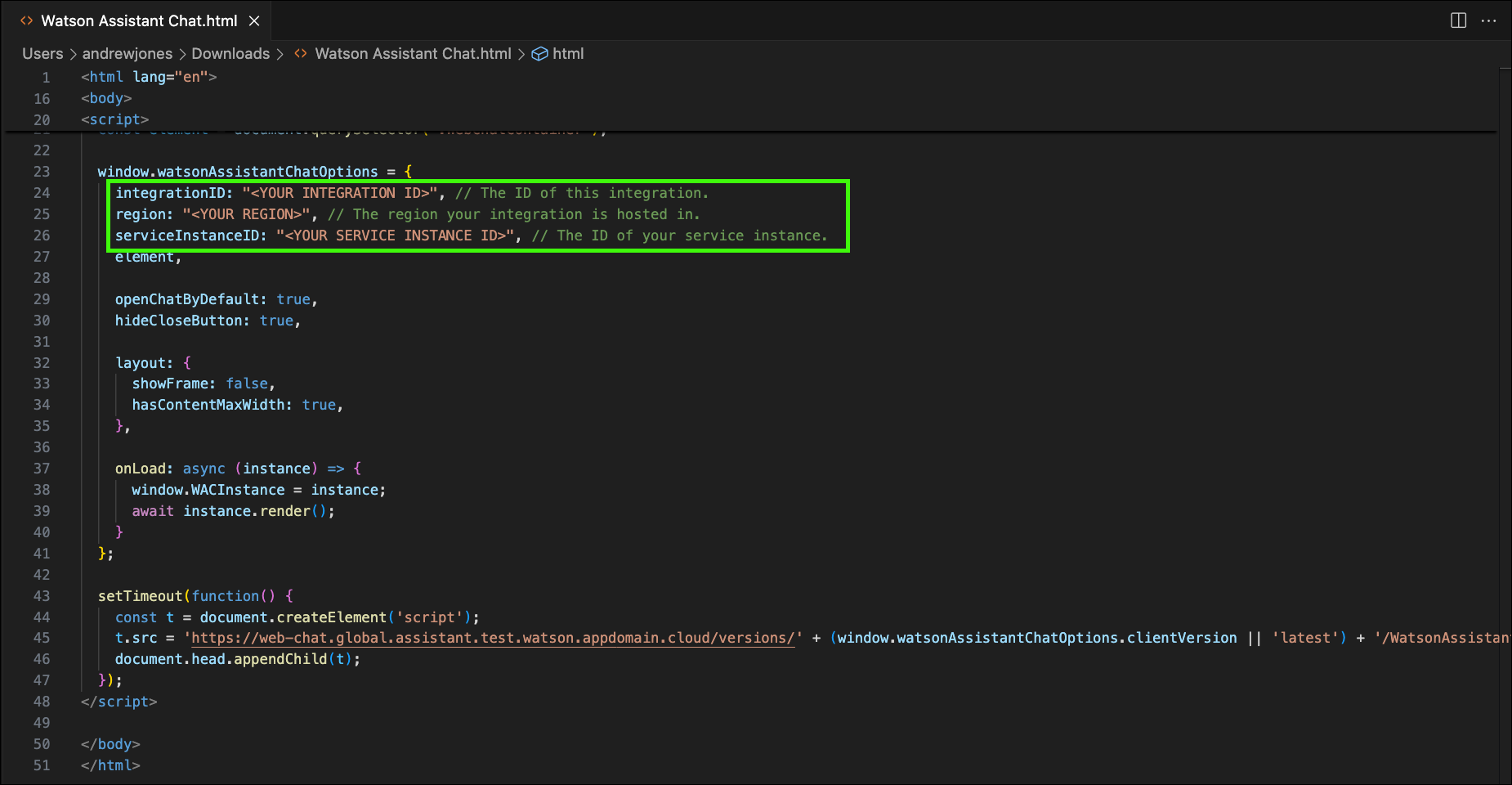 <html lang="en"> <head> <title>Watson Assistant Chat</title> <meta name="viewport" content="width=device-width, initial-scale=1"> <style> .WebChatContainer { position: absolute; left: 0; right: 0; top: 0; bottom: 0; } </style> </head> <body> <div class="WebChatContainer"/> <script> const element = document.querySelector('.WebChatContainer'); window.watsonAssistantChatOptions = { integrationID: "<YOUR INTEGRATION ID>", // The ID of this integration. region: "<YOUR REGION>", // The region your integration is hosted in. serviceInstanceID: "<YOUR SERVICE INSTANCE ID>", // The ID of your service instance. element, openChatByDefault: true, hideCloseButton: true, layout: { showFrame: false, hasContentMaxWidth: true, }, onLoad: async (instance) => { window.WACInstance = instance; await instance.render(); } }; setTimeout(function() { const t = document.createElement('script'); t.src = 'https://web-chat.global.assistant.test.watson.appdomain.cloud/versions/' + (window.watsonAssistantChatOptions.clientVersion || 'latest') + '/WatsonAssistantChatEntry.js'; document.head.appendChild(t); }); </script> </body> </html> -