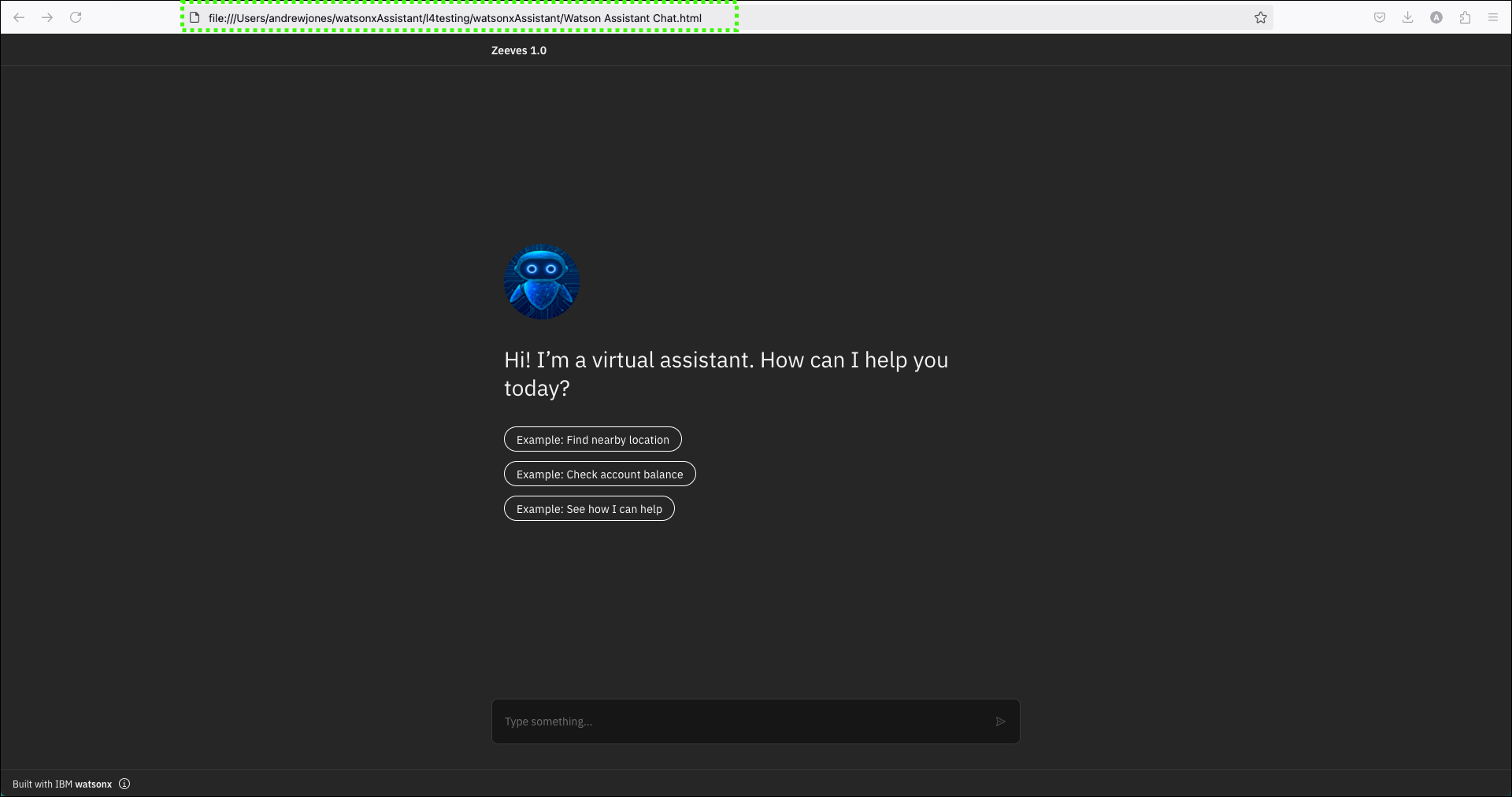 Watson Assistant Chat.htmlfile in a web browser.