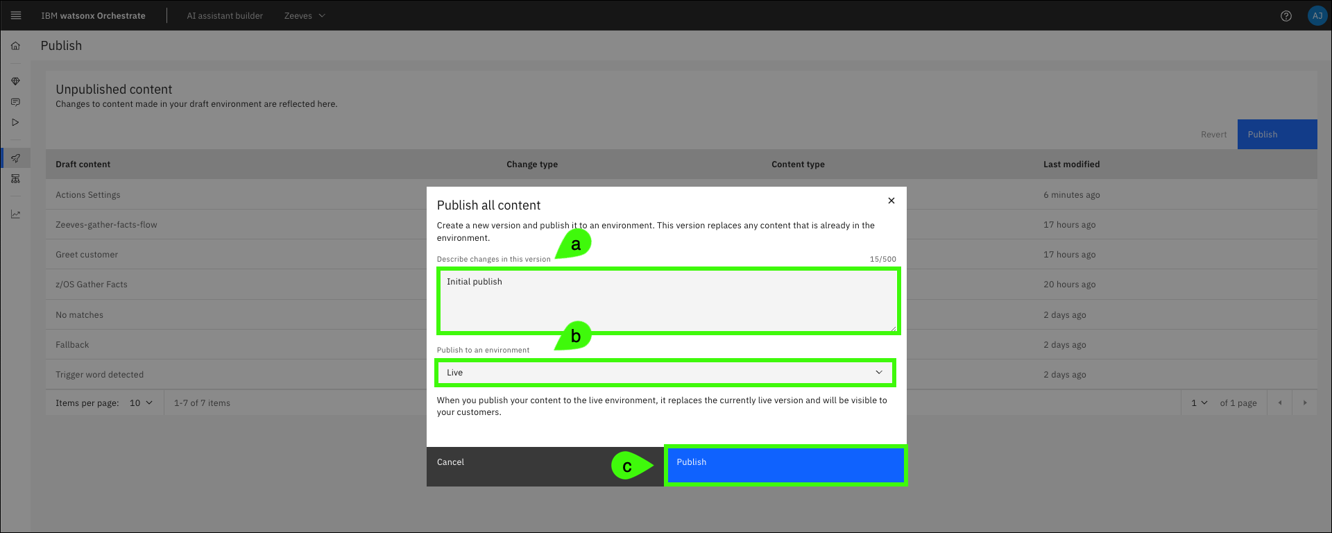 Enter a description of the changes (a), set the environment to Live (b), and then click Publish (c).