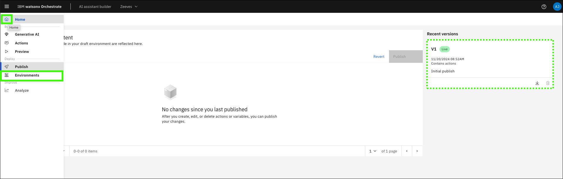 Open the Environments page in the AI assistant builder.