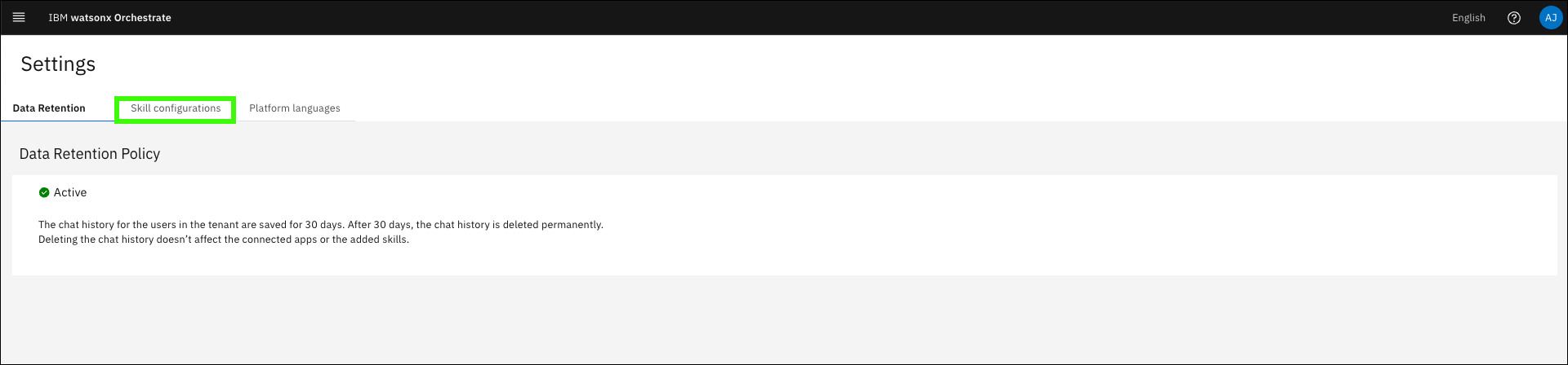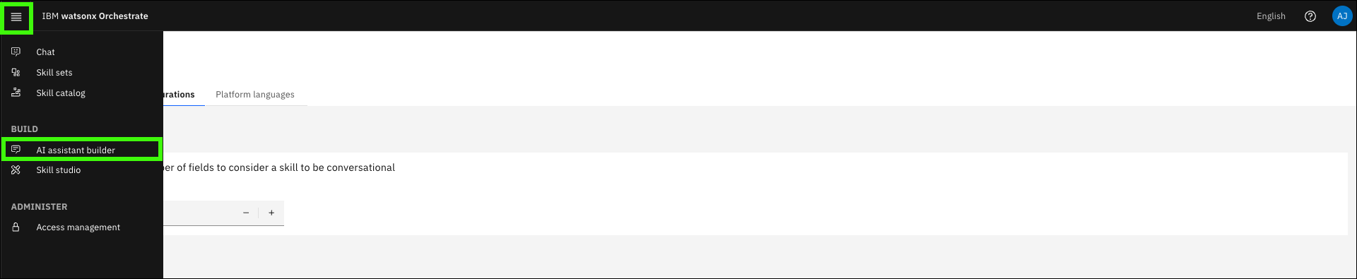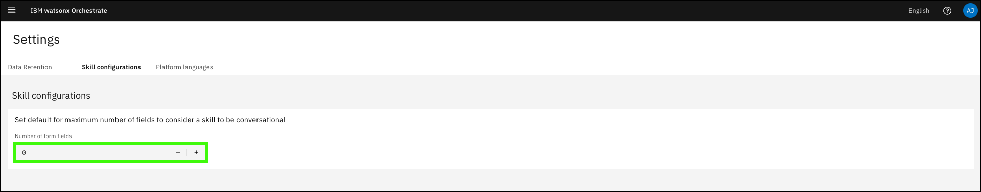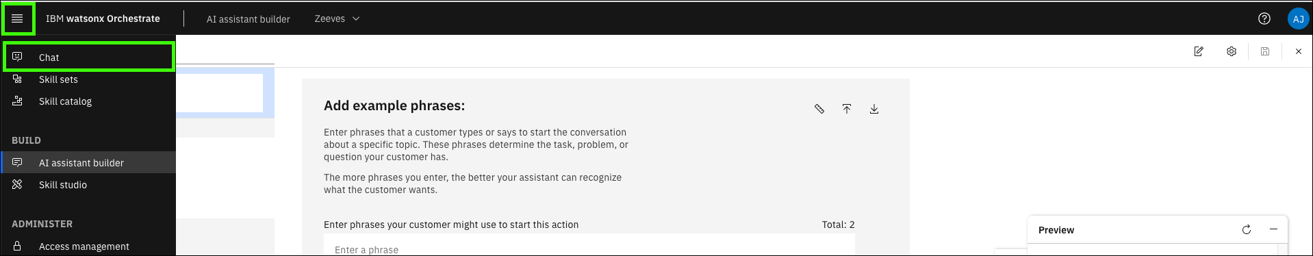 Before configuring actions, it is important to modify a setting within watsonx Orchestrate that allows triggered skills to display as forms (versus conversational skills).