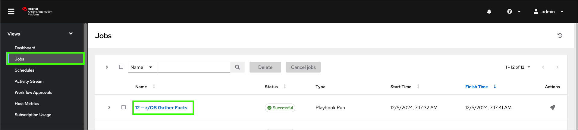 Click Jobs and then click the job number that you recorded in the previous step for the z/OS Gather Facts skill.