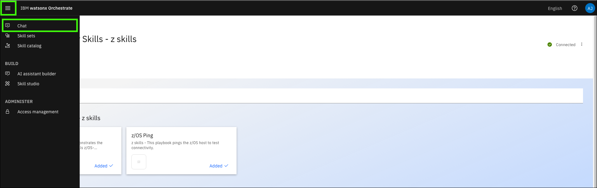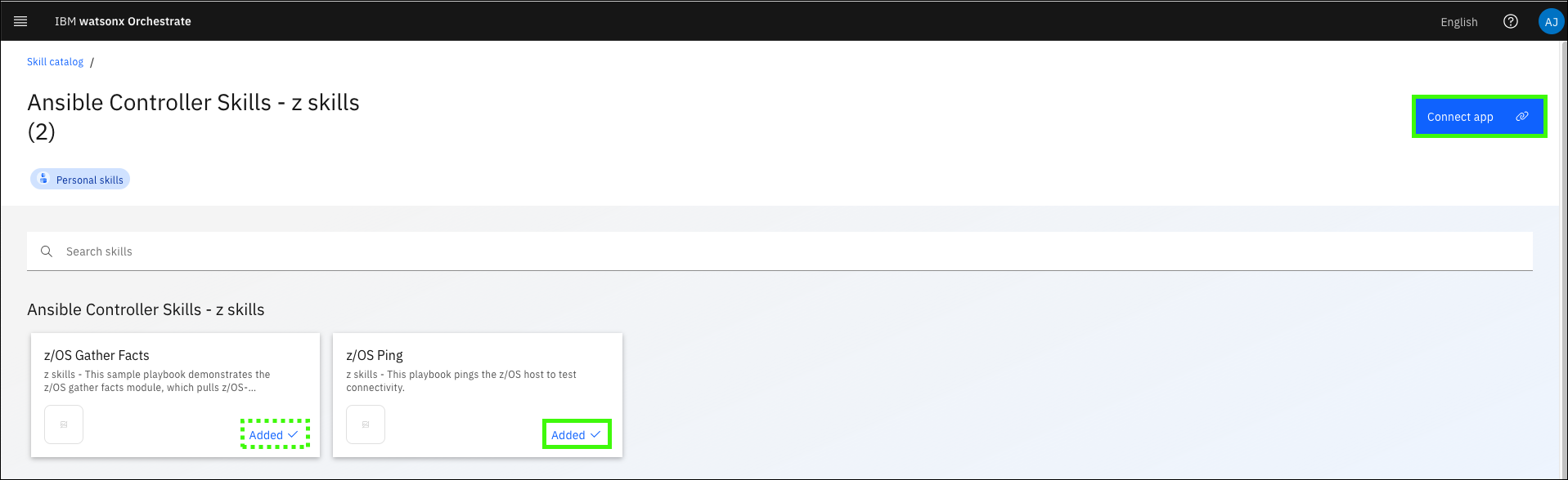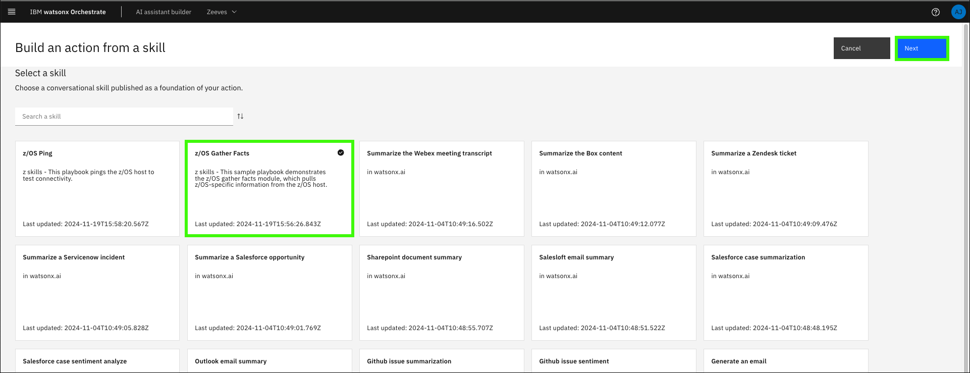 Note, it may take a minute for the page to display the action tiles. The date that is shown in the z/OS Gather Facts tile reflects when you added the skill to your application.