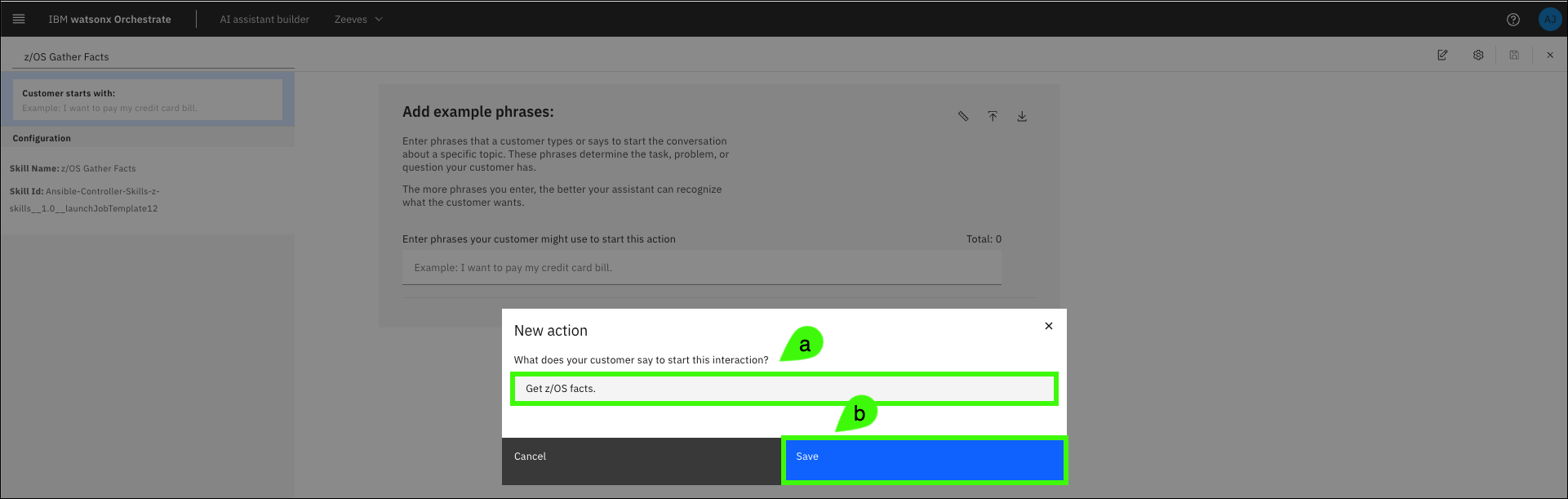 On the New action dialog, (a) enter a prompt a user of the assistant might use to initiate the action and then (b) click Save.